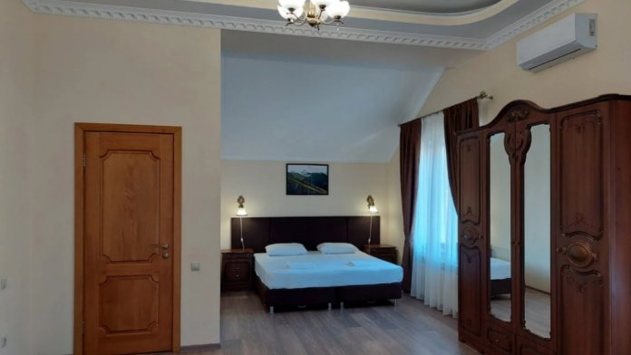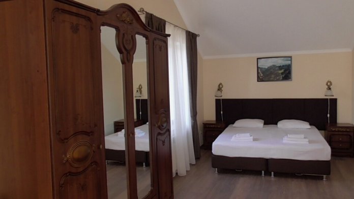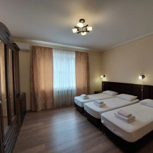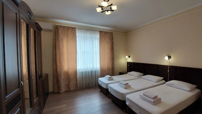 В номере односпальные кровати, которые крепятся вместе и получается полноценная двуспальная кровать, два футона, трюмо, журнальный столик, есть WI-FI, телевизор, холодильник, кондиционер, шкаф, комод, прикроватные тумбочки, стулья, санузел, ванна, фен, лицевое, банное, ножное полотенца, мыло, шампунь, гель для душа. По требованию выдаем пляжные полотенца. Гладильные принадлежности.