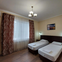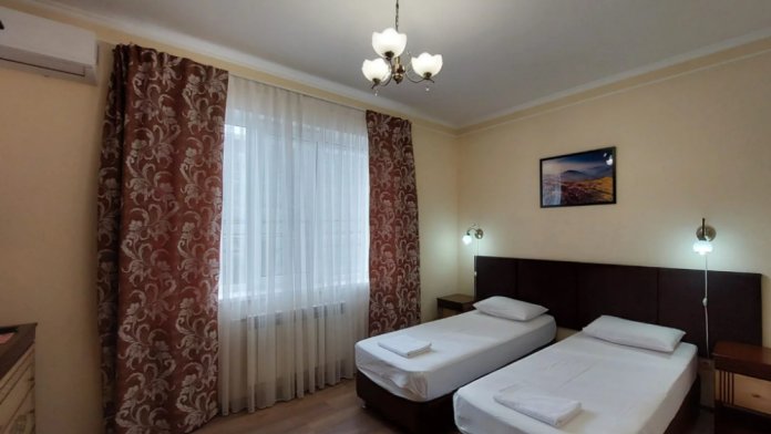 В номере односпальные кровати, которые крепятся вместе и получается полноценная двуспальная кровать, есть WI-FI, телевизор, холодильник, кондиционер, шкаф, комод, прикроватные тумбочки, стулья, санузел, душ, фен, лицевое, банное, ножное полотенца, мыло, шампунь, гель для душа. По требованию выдаем пляжные полотенца. Гладильные принадлежности.