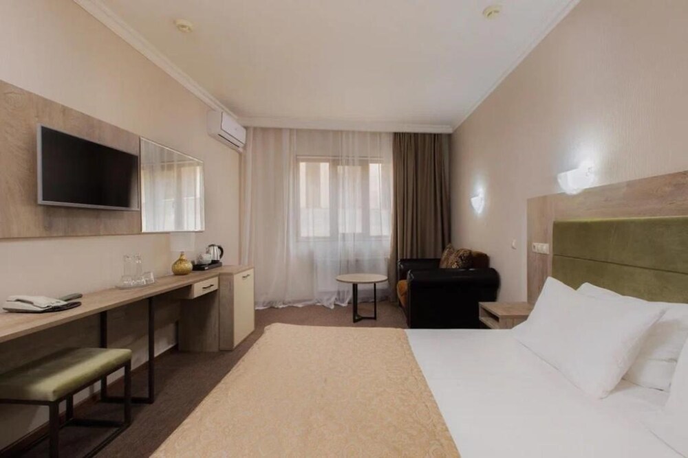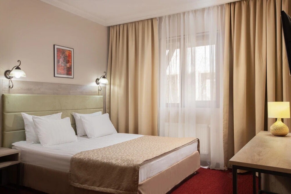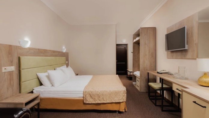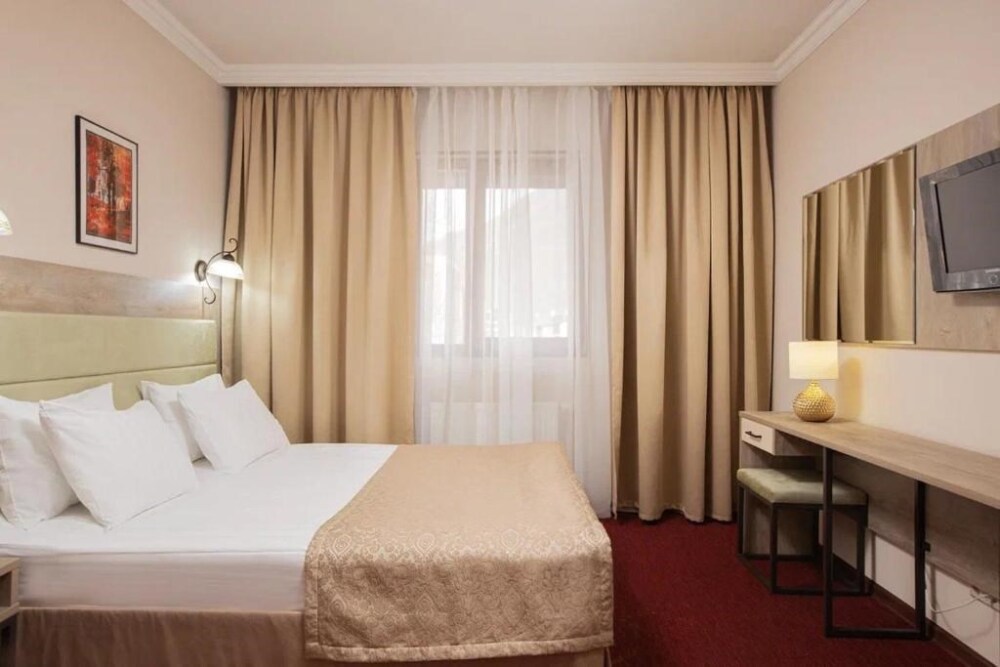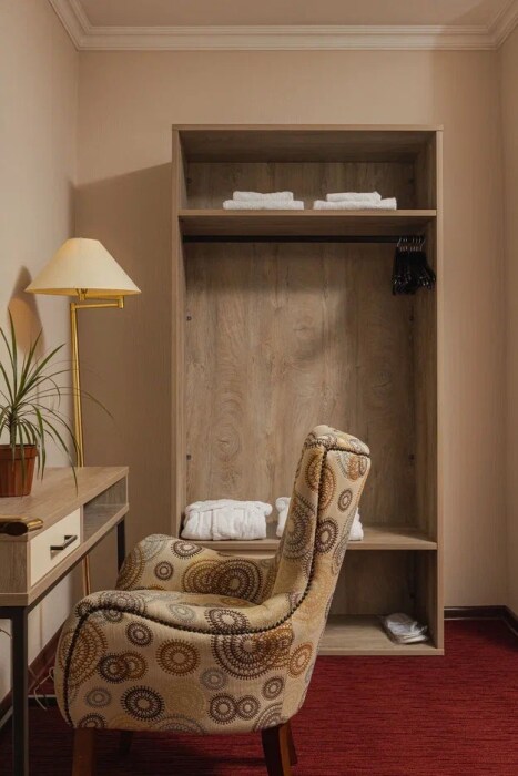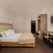 В номере: одна двуспальная кровать или две раздельные, полукресло, прикроватные тумбы, шкаф для одежды, рабочий стол, бесплатный WI-FI.
