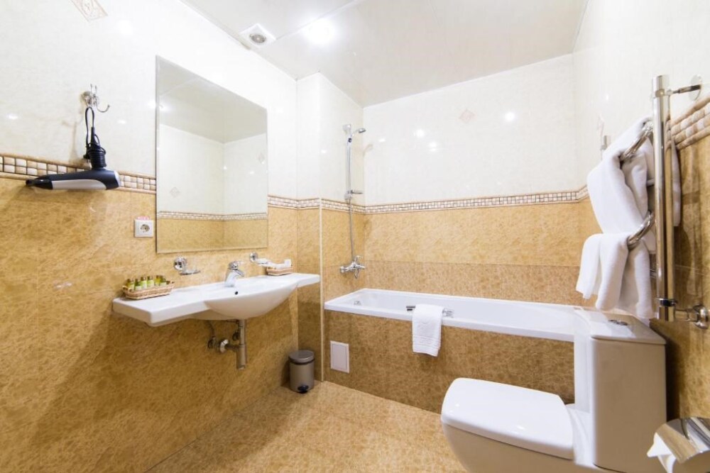 В ванной: ванна, раковина, туалет, фен, комплект полотенец, гигиенические принадлежности: шампунь, гель,( зубной набор, халат, тапочки/по запросу/.)