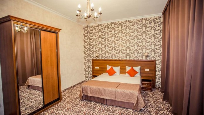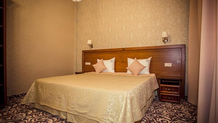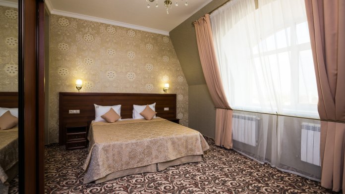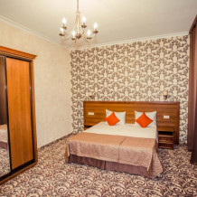 Люкс двухкомнатный, общая площадь 70 м2. В номере спальня с одной большой двухспальной кроватью и зал с раскладным диваном и обеденным столом, предметами сервировки на 4 персоны.