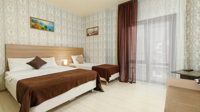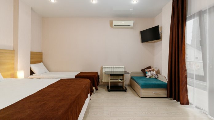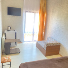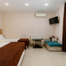 Комфортный семейный номер с одной двухспальной, одной односпальной кроватью, диваном для 2 человек. Оснащён сплит-системой, электрическим чайником и спутниковым TV. Подойдет для размещения 5 человек. Датчик угарного газа обеспечивает безопасность. Напольное покрытие ламинат. В ванной комнате установлен душ и есть все необходимые туалетно-косметические принадлежности, фен и полотенца. С балкона открывается вид на дворик.