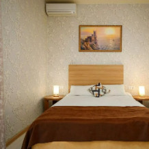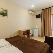 Комфортный 3-местный номер с одной двухспальной кроватью и дополнительным местом (диван-софа для одного гостя). Оснащён сплит-системой , электрическим чайником и спутниковым TV. Подойдет для размещения трёх человек. Датчик угарного газа обеспечивает безопасность. Напольное покрытие- ламинат. В ванной комнате установлена ванна и есть все необходимые туалетно-косметические принадлежности, фен и полотенца. С балкона открывается вид на город .
