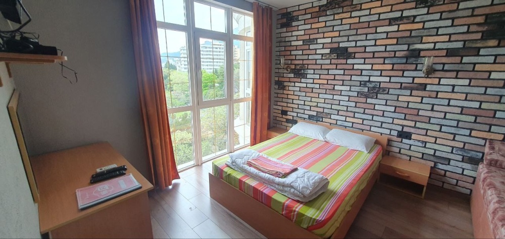 Семейный номер на 4-5 этаже, состоящий из спальни, небольшой полноценной кухни. Из всех окон и с балкона открывается шикарный вид на море и горы Ай Петри. В номере двуспальная кровать и раскладной диван. Номер также оборудован кондиционером, набором посуды, текстиля, полотенец, стиральной машиной. Отличительная черта данного номера в том, что регулярно на балкон прилетает дрессированная чайка (на фото), которая может составить Вам компанию за еду).