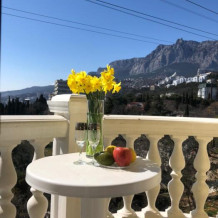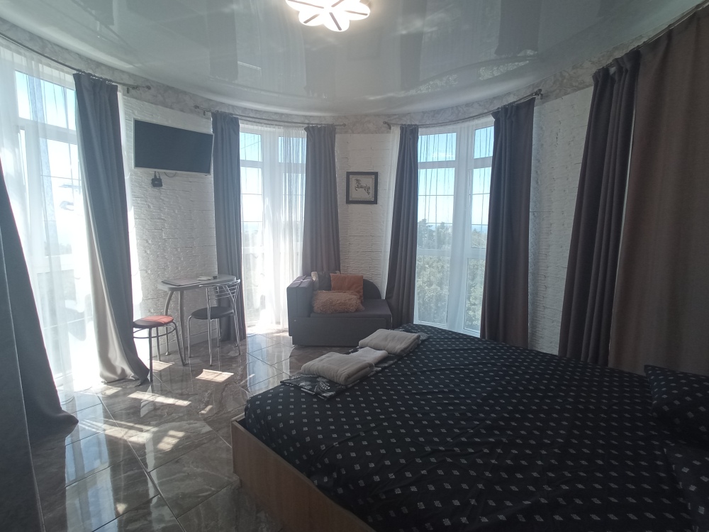 Круглый видовой номер с мини кухней. Из всех окон открывается шикарный вид на море, горы Ай-Петри, ближайшие парки и поселки вплоть до Алупкинской гряды.