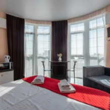 Люкс имеет полноценную кухню. Состоит из спальни и кухни-гостиной. Имеет 2 небольших балкона с боковым видом на море и город. Площадь номера 40-44кв/м. Номер также оборудован кондиционером, набором посуды, текстиля, полотенец, стиральной машиной. В номере телевизор со спутниковым ТВ, двуспальная кровать, двуспальный диван и односпальный диван.