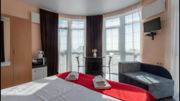По кругу расположены 4 витражных окна в пол. В номере имеется 2 спальная кровать, односпальный диван, шкаф, стол, фен, кондиционер, телевизор со спутниковым ТВ, микроволновка, электроплита, холодильник, эл. чайник, мультиварка, набор посуды.