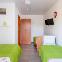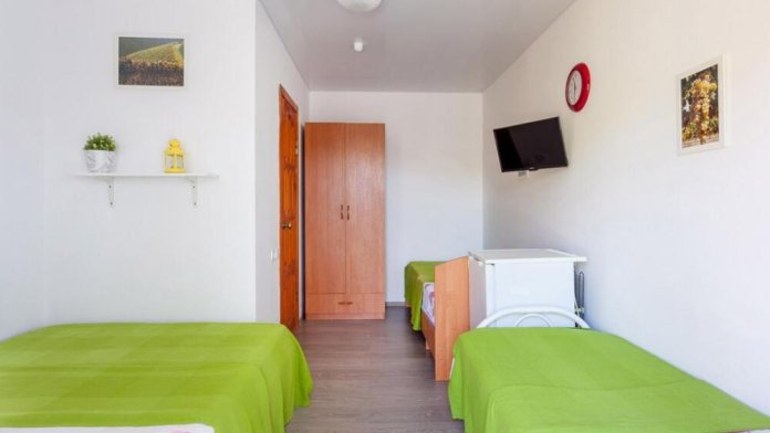 В корпусе №1 имеется 5 номеров с общей кухней. В каждом номере свой санузел с душевой кабиной, постоянное горячее и холодное водоснабжение, телевизор, сплит-система, холодильник, шкаф для одежды. Номер рассчитан на 3-4 человек. Около номера расположены стол со стульями.