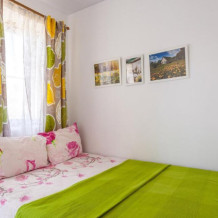 Апартаменты состоят из двух комнат, оборудованной всем необходимым кухни, санузла и открытой террасы (14 кв.м.). Подходят для размещения 5-7 человек. Возможно добавить двухъярусную, односпальную или детскую кровать. Сплит-система расположена во входной группе, что позволяет распределять прохладный воздух по всему помещению. Кухня оборудована мойкой с горячей и холодной водой, газовой плитой, холодильником, электрическим чайником, микроволновой печью, столом со стульями, посудой для приготовления и употребления пищи. В санузле установлены стиральная машинка и сушка для белья.