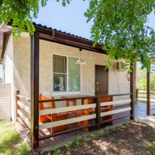К номеру пристроена кухня-веранда площадью 9 кв.м., на которой есть мойка с горячей и холодной водой, плита, стол с 4 стульями, индивидуальная посуда.