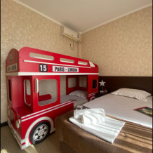 Идеальный семейный номер на четверых человек. В номере: 2-спальная кровать и двухъярусная кровать, заправленные чистым постельным бельем. Есть все, для Вашего удобства: холодильник, телевизор, письменный стол, 2 стула, 2 тумбочки, кондиционер, быстрый интернет, шкаф для одежды, фен, балкон. Номер с удобствами, каждому гостю выдается гигиенический набор и 3 полотенца.