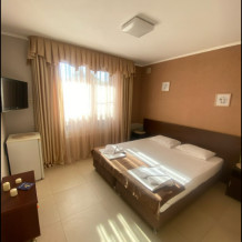 Небольшой номер площадью 20 кв метров. В номере удобная 2-спальная кровать king size, заправленная чистым постельным бельем. Есть все для Вашего удобства: холодильник, телевизор, стол, 2 стула, тумбочка, чайник электрический, кондиционер, шкаф для одежды, быстрый интернет. Удобства в номере, душ, фен, гигиенический набор и по 3 полотенца для каждого гостя.