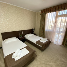 В номере две односпальные кровати, заправленная чистым постельным бельем. Для Вашего удобства: холодильник, телевизор, письменный стол, чайник электрический, кондиционер, необходимая мебель, средства для чистки обуви и одежды. Есть балкон с видом на город. В номере все удобства, каждому гостю предоставляется гигиенический набор, полотенца.