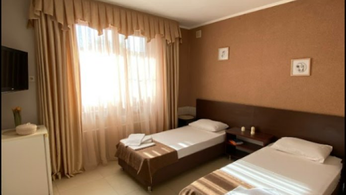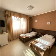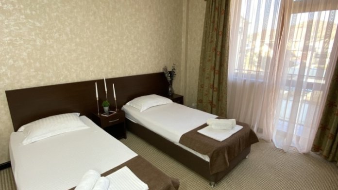Небольшой номер площадью 20 кв метров. В номере две односпальные кровати, заправленные чистым постельным бельем. Есть все для Вашего удобства: холодильник, телевизор, стол, 2 стула, тумбочка, кондиционер, шкаф для одежды, быстрый интернет. Удобства в номере, душ, фен, гигиенический набор и по 3 полотенца для каждого гостя.