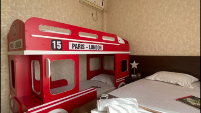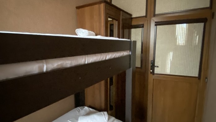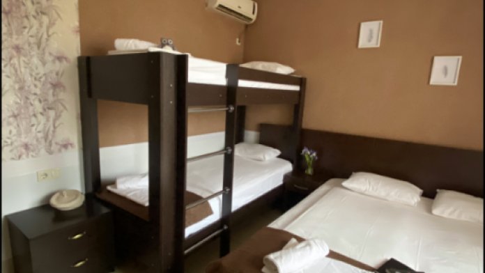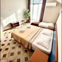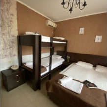 Небольшой номер площадью 20 кв. метров. В номере удобная 2-спальная кровать king size, заправленная чистым постельным бельем и двухъярусная кровать. Есть все для Вашего удобства: холодильник, телевизор, стол, 2 стула, тумбочка, кондиционер, шкаф для одежды, быстрый интернет. Удобства в номере, душ, фен, гигиенический набор и по 3 полотенца для каждого гостя
