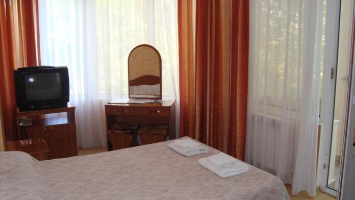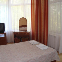 В номере: двухспальная кровать, платяной шкаф, туалетный столик, 2 прикроватные тумбочки, 2 стула, тумба под телевизор, тумба для багажа, телевизор - ЖК, холодильник, санузел (душ. кабина, унитаз, умывальник, зеркало), кондиционер.
