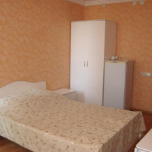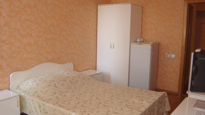 1 комната: двухспальная кровать, платяной шкаф, 2 прикроватные тумбочки, 2 стула, тумба под телевизор, телевизор, холодильник, кондиционер.