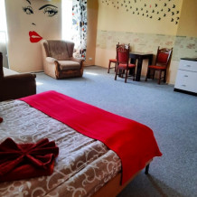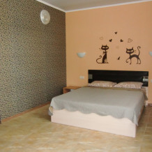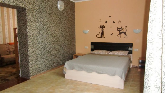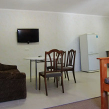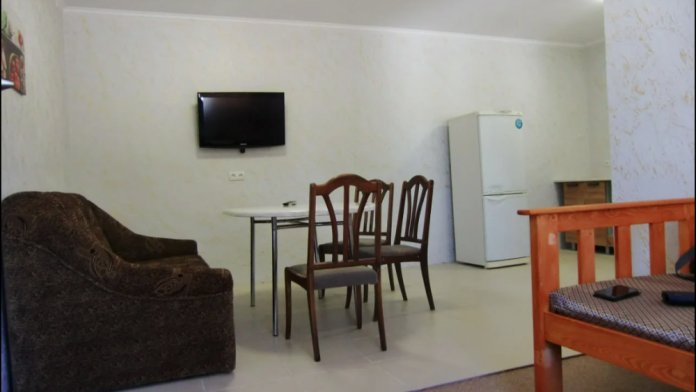 Номера расположены в 1-но этажном корпусе, имеют индивидуальный вход. Отдельная спальня и кухня гостиная. 2 кондиционера (спальня, гостиная). 2 санузла. Кухня оборудована необходимыми бытовыми приборами, мебелью. Отдельно установлен электросчетчик, затраты по электроэнергии добавляются к суточной стоимости.
