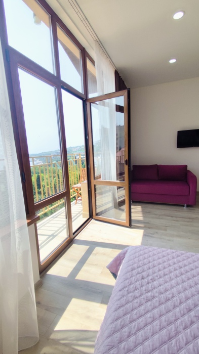 Приглашаем снять однокомнатный номер с видом на море и горы. Номер просторный, уютный, новая мебель, небольшой балкон, вид на море. Имеется телевизор с кабельным ТВ, холодильник, кондиционер, микроволновая печь, электрочайник, горячая и холодная вода круглые сутки. Номер рассчитан на 2-4 чел. До начало набережной спуститься 5 минут, подняться 7 мин. В коттедже есть внутренний дворик, где размещена мангальная зона, общая стиральная машина и мини кухня с электрической плитой. Вы отдохнёте в комфорте и уюте и ваш отдых в Гурзуфе будет незабываемым.