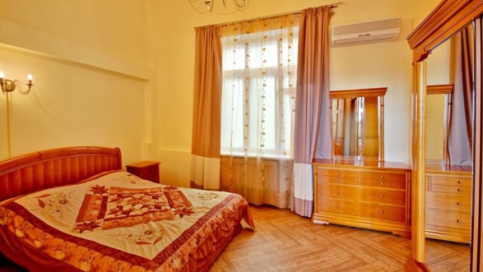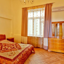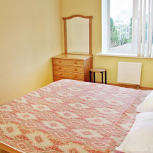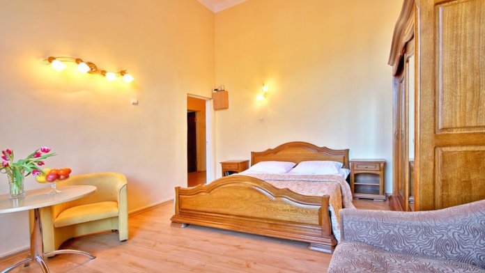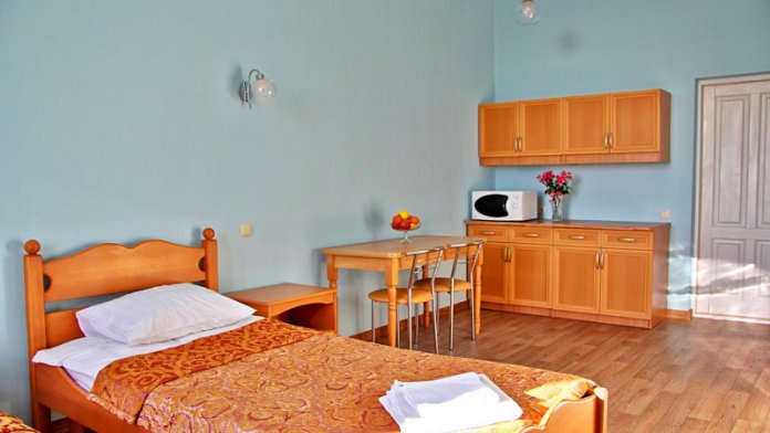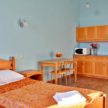 Номер состоит из спальни с одной семейной кроватью, гостиной, в которой расположен раскладной диван, и оборудованной мини-кухней, отдельный санузел и душевая кабина, что позволит разместиться трем-четырем человек.