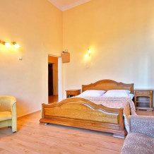 Однокомнатный просторный номер общей площадью 25-26 м2, с одной семейной кроватью или двумя одно- или полутороспальными кроватями. В виде дополнительного места представлены раскладной диван или кресла, что позволяет комфортно разместиться от двух до четырех человек.