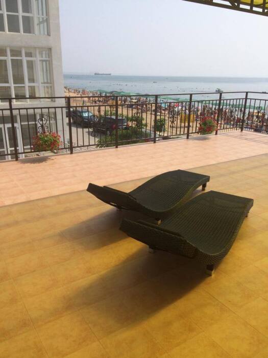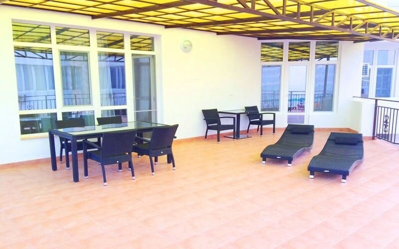 Номер расположен на 2 этаже с большой террасой, которая укомплектована шезлонгами, столиком, стульями и сушкой для белья.