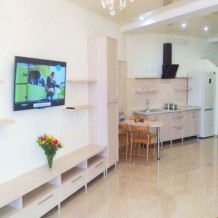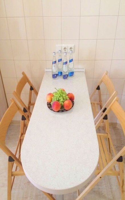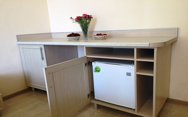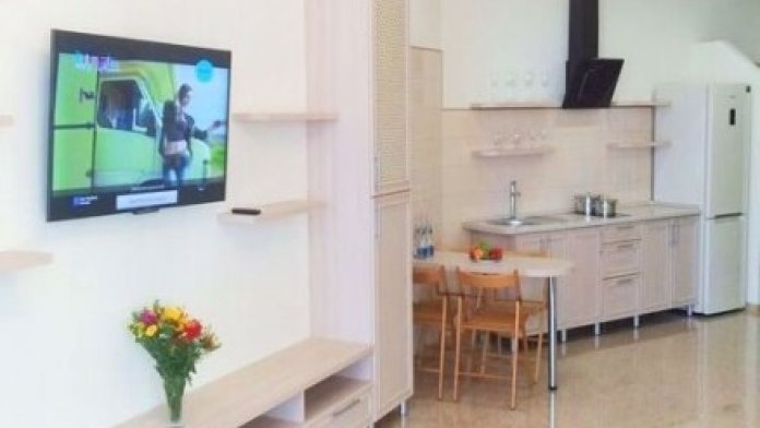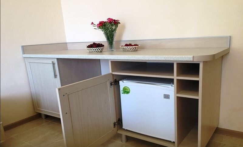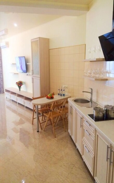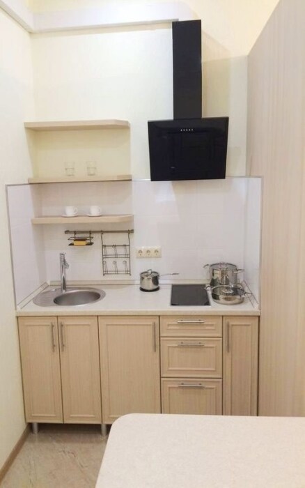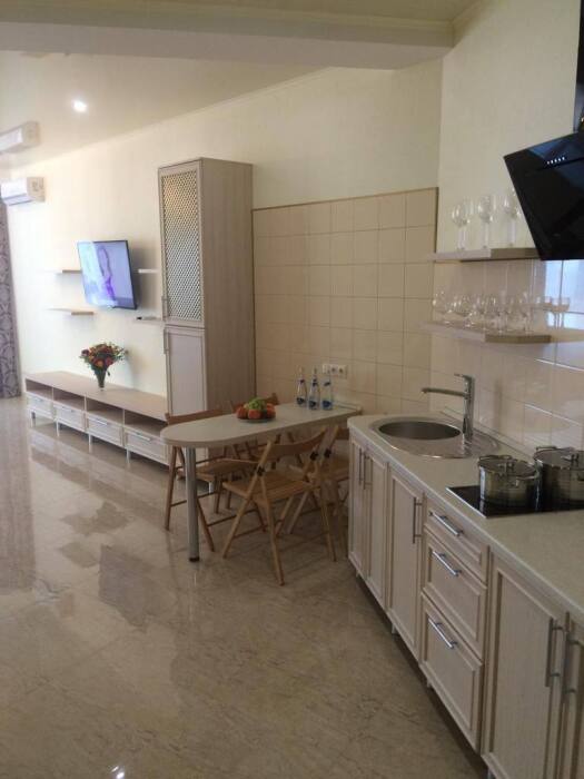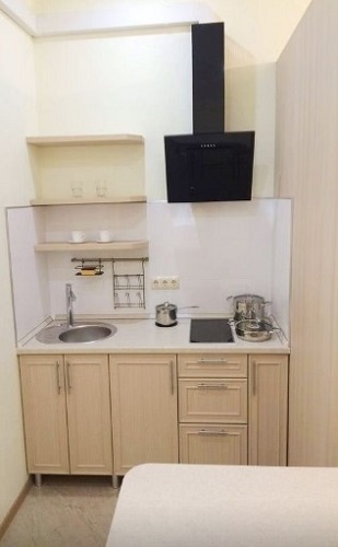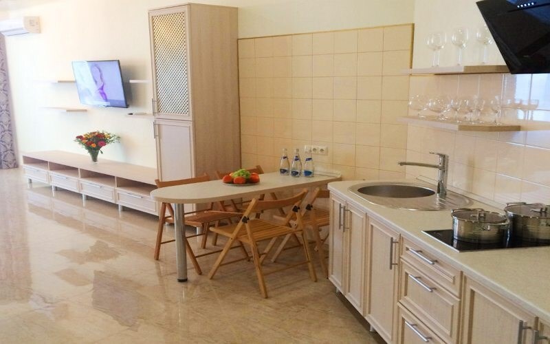 Номер оснащен кухней (индукционная плита, вытяжка, раковина, набор посуды и кастрюли).