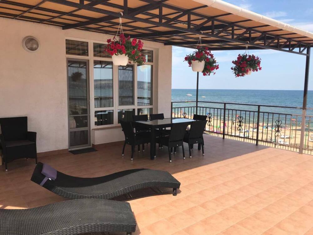 Расположен на 2 этаже, с большой террасой. Терраса укомплектована шезлонгами, столиком, стульями и сушкой для белья.