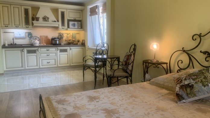 В номере кондиционер,беспроводной WI-FI интернет,плазменный телевизор,двуспальная кровать,шкаф,индивидуальный сейф,прикроватные тумбочки,два кресла+кофейный столик,сушка для белья,также в номере кухонная зона-холодильник,мультиварка с керамической чашей на 5 литров,электро чайник,микроволновка,необходимая кухонная и столовая посуда,мойка с подачей холодной и горячей водой.