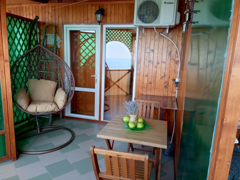 Замечательный вариант для семьи из четырёх человек. Просторный,солнечный,уютный номер студия с видовыми окнами,с летней террасой 12 м2,номер и летняя терраса обшиты деревом,вагонкой из сосны,что придаёт обстановке уют и комфорт. Цифровое телевидение. Фен предоставляется гостям при необходимости. Стиральная машинка за отдельную оплату. Есть возможность пользоваться микроволновой печью. На террасе есть мебель для отдыха,освещение,цветы и главное отличный вид на море!!!