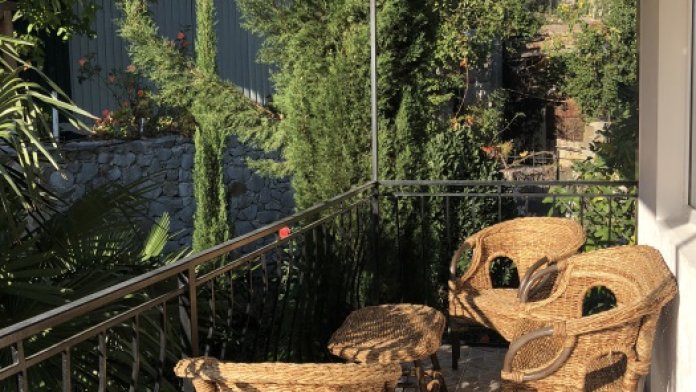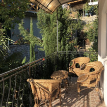 На втором этаже одна большая просторная комната-зал: раскладной двухспальный диван, два раскладных кресла-кровати, плазменный телевизор, комод, шкаф, кондиционер. Комната имеет выход на 2 балкона, балконы оборудованы удобной плетённой мебелью для комфортного отдыха, вид на горы и частично на море.