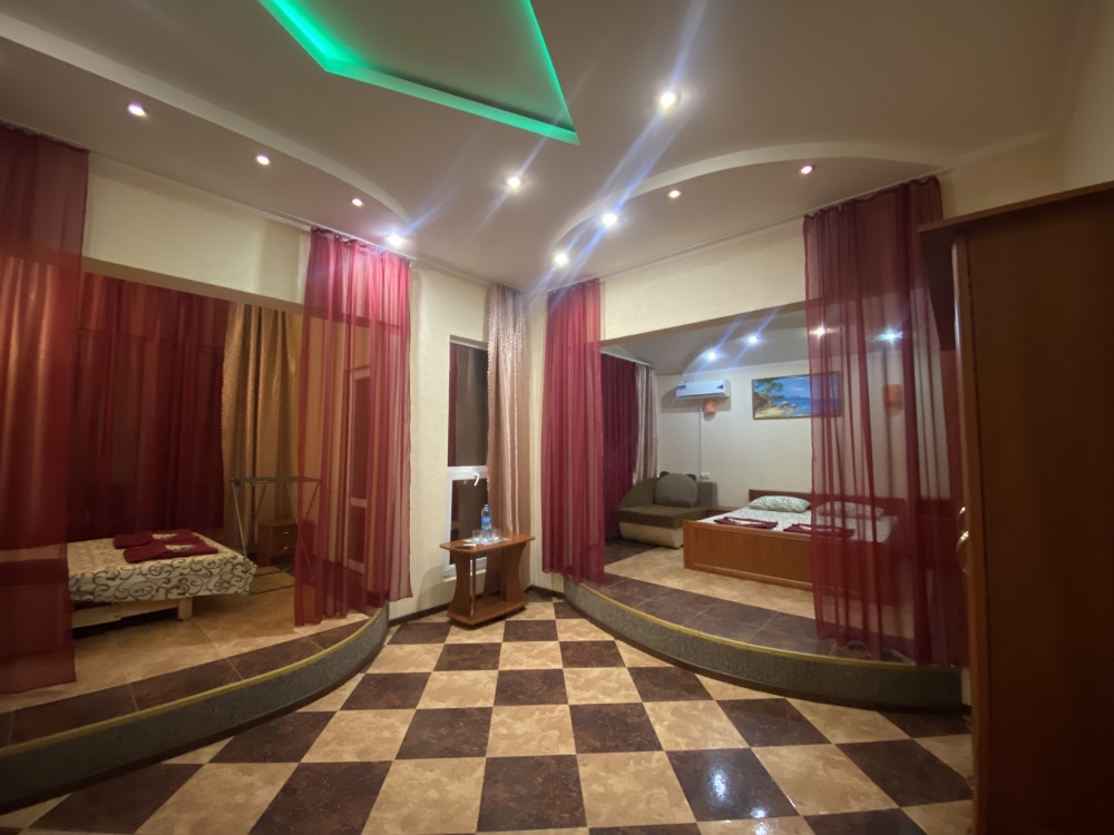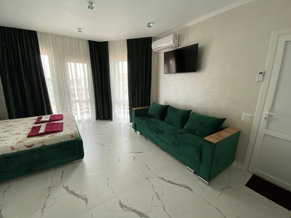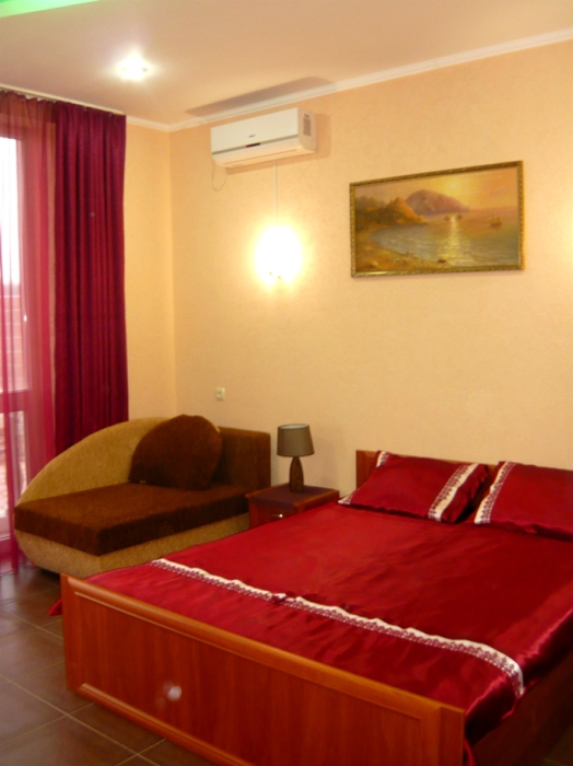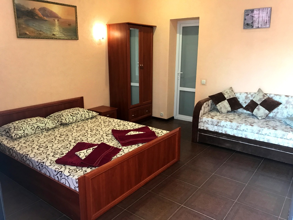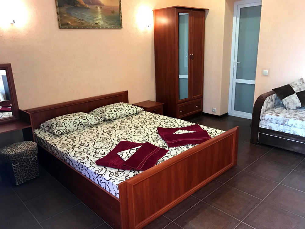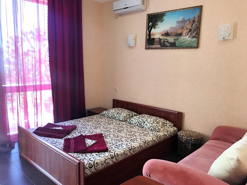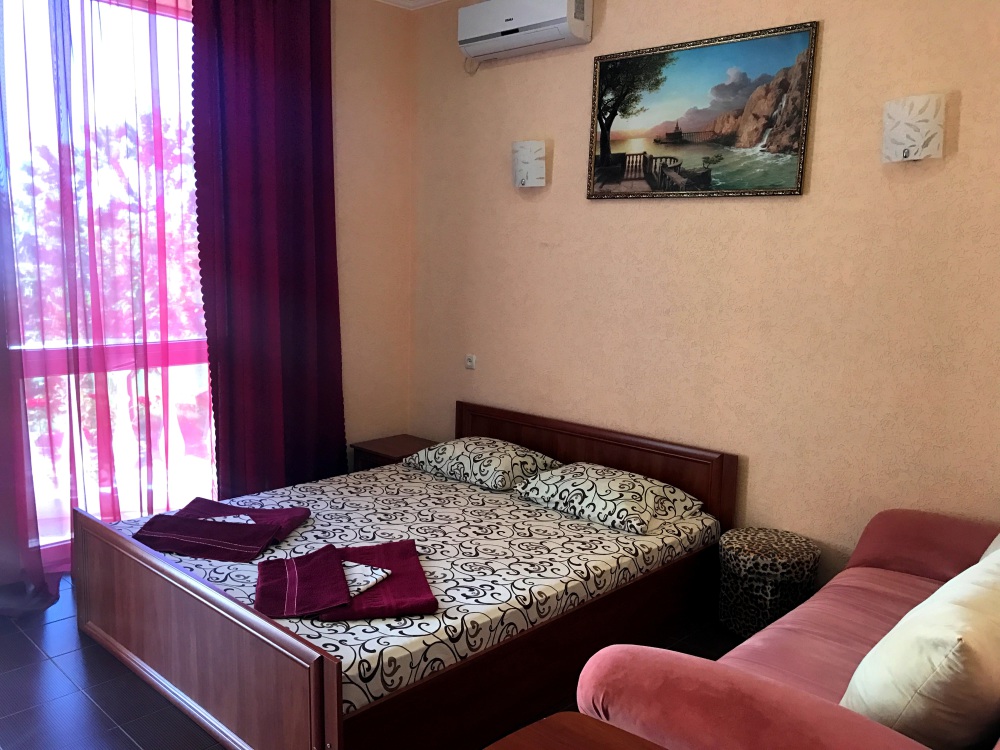 Супер Люкс Студия - номер представляет собой комфортабельные апартаменты – 52 кв.м., поделен на две функциональные зоны – спальня и гостиная, балкон с шикарным видом на море, наличие всех удобств: кондиционер, душевая кабина, туалет, умывальник, холодильник, плазменный телевизор, Wi-Fi, горячая и холодная вода - круглосуточно; вся необходимая мебель: двуспальная кровать, шкаф с зеркалом, прикроватные тумбочки, туалетный столик, комод, стулья. Питание включено в указанную стоимость. Номера имеются разной вместимости: двух, трех, четырех и пятиместные.