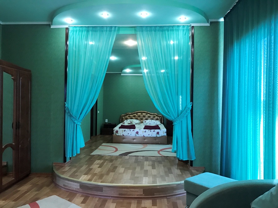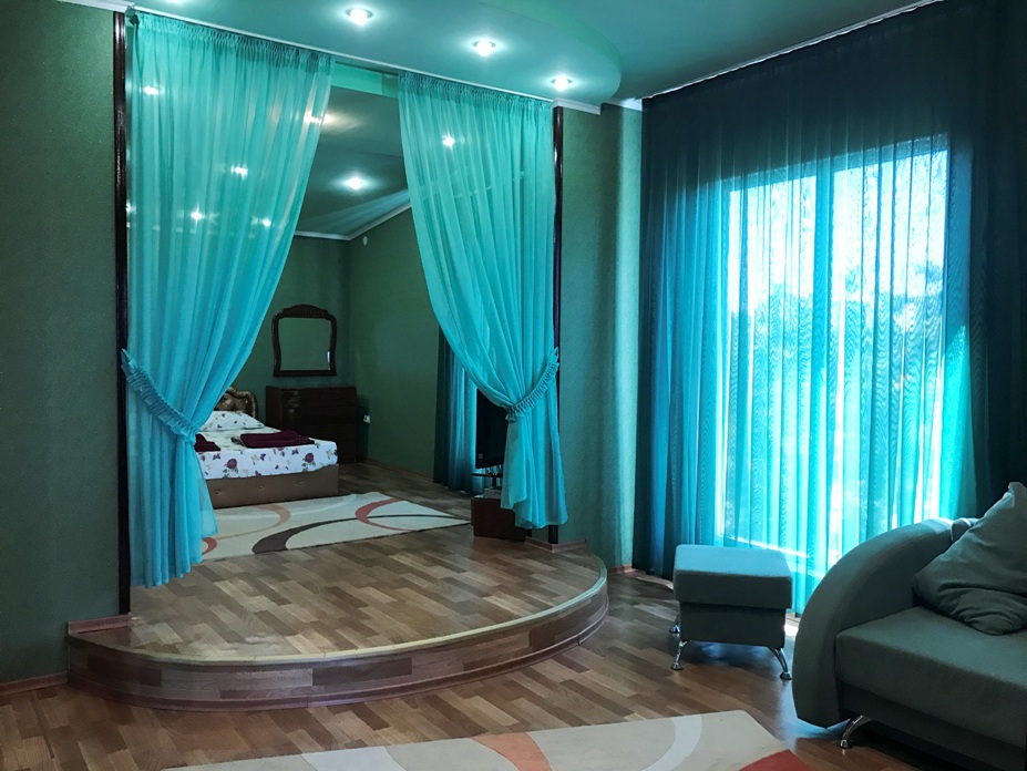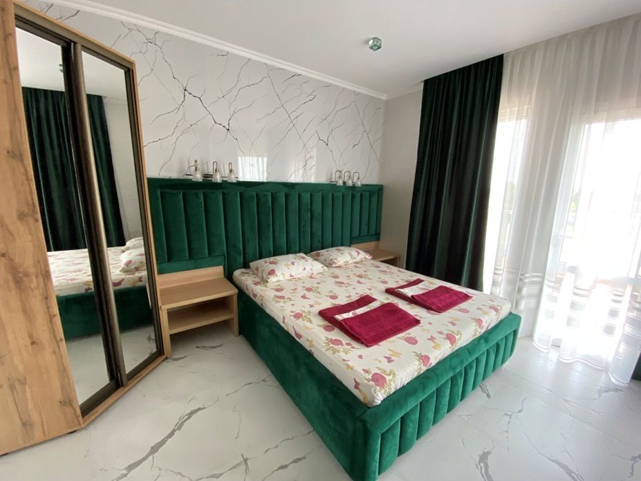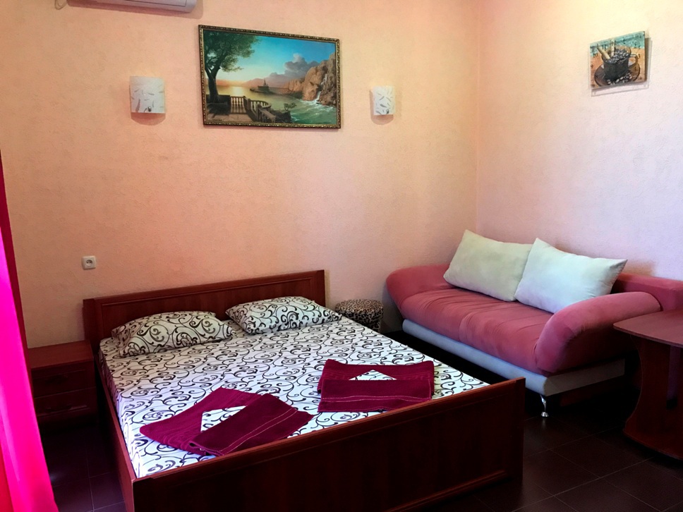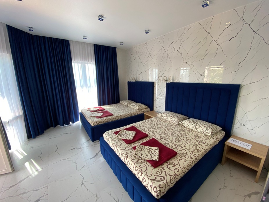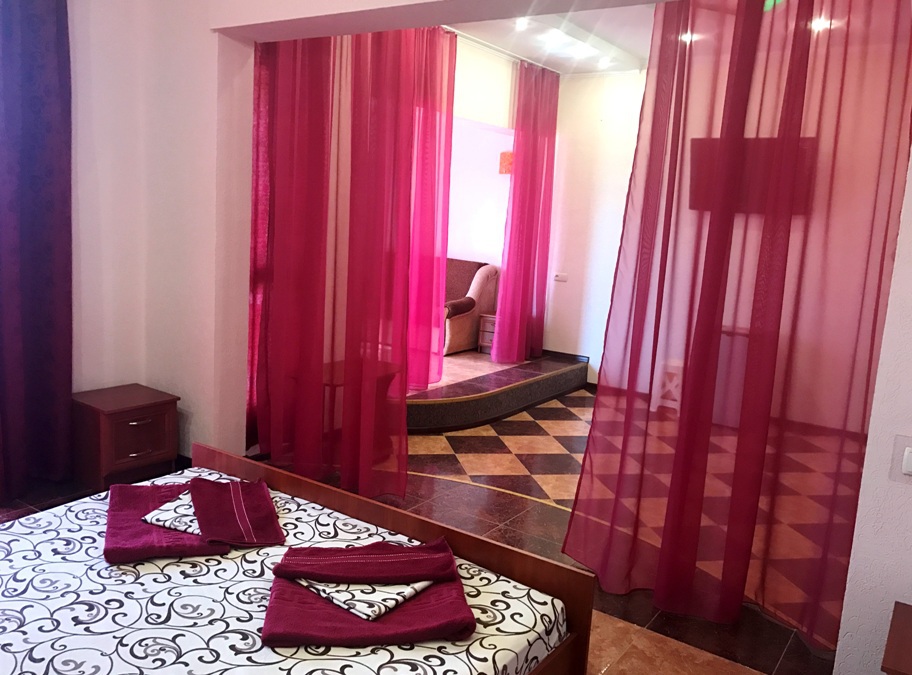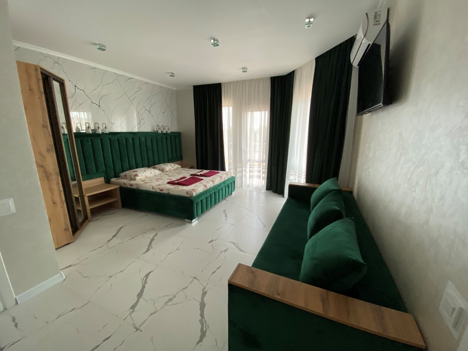 Супер Люкс Студия - номер представляет собой комфортабельные апартаменты – 52 кв.м., поделен на две функциональные зоны – спальня и гостиная, балкон с шикарным видом на море, наличие всех удобств: кондиционер, душевая кабина, туалет, умывальник, холодильник, плазменный телевизор, Wi-Fi, горячая и холодная вода - круглосуточно; вся необходимая мебель: двуспальная кровать, шкаф с зеркалом, прикроватные тумбочки, туалетный столик, комод, стулья. Питание включено в указанную стоимость. Номера имеются разной вместимости: двух, трех, четырех и пятиместные.