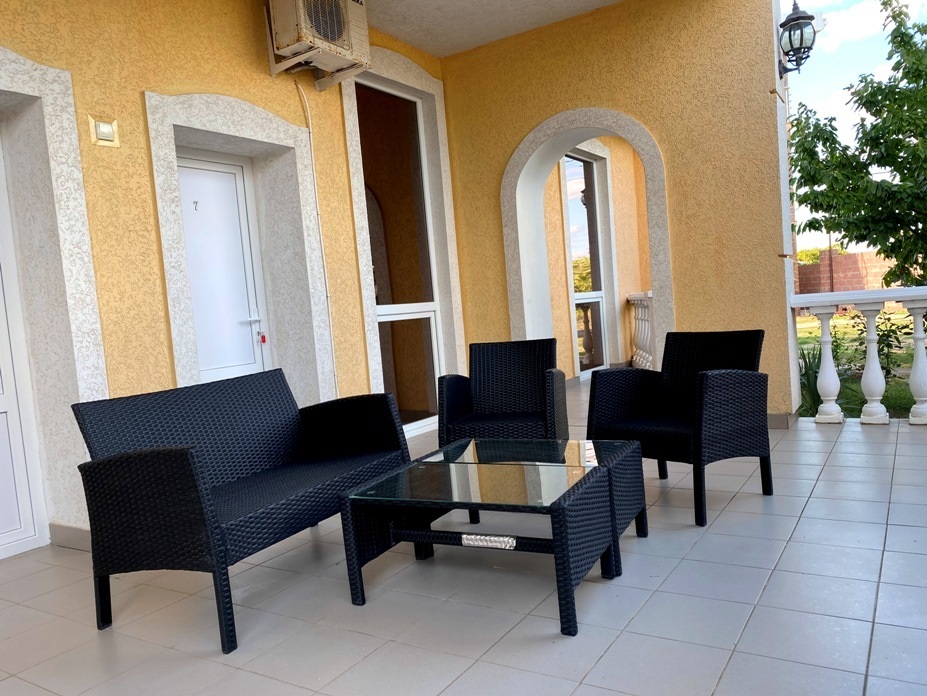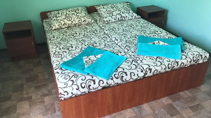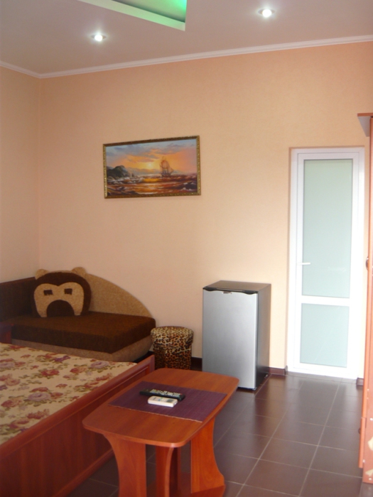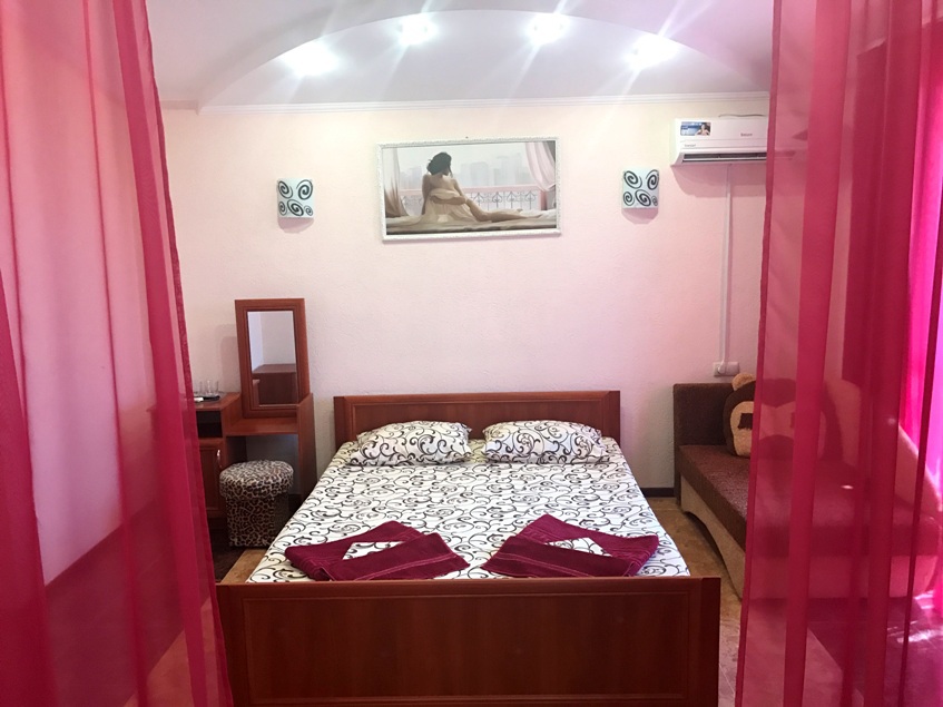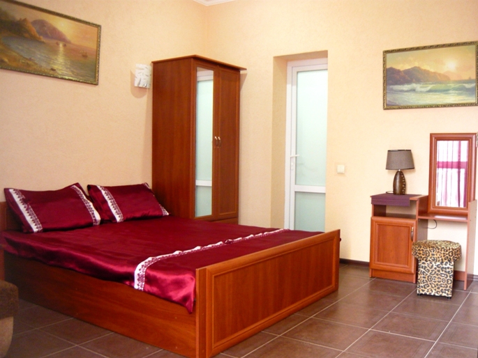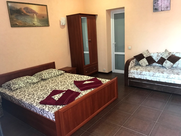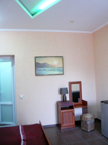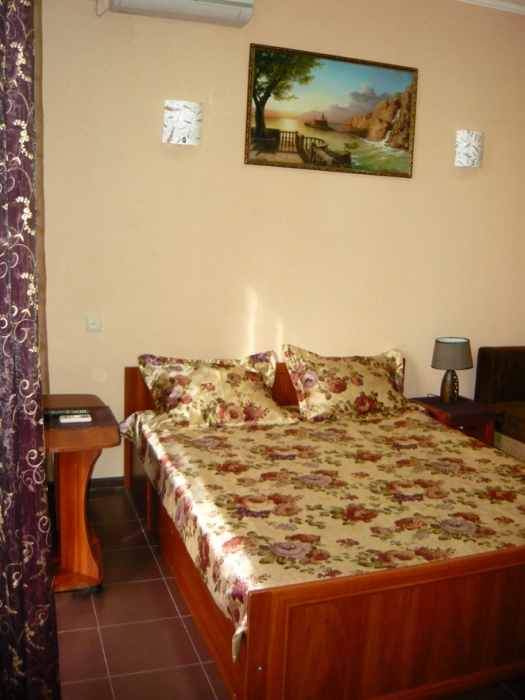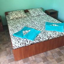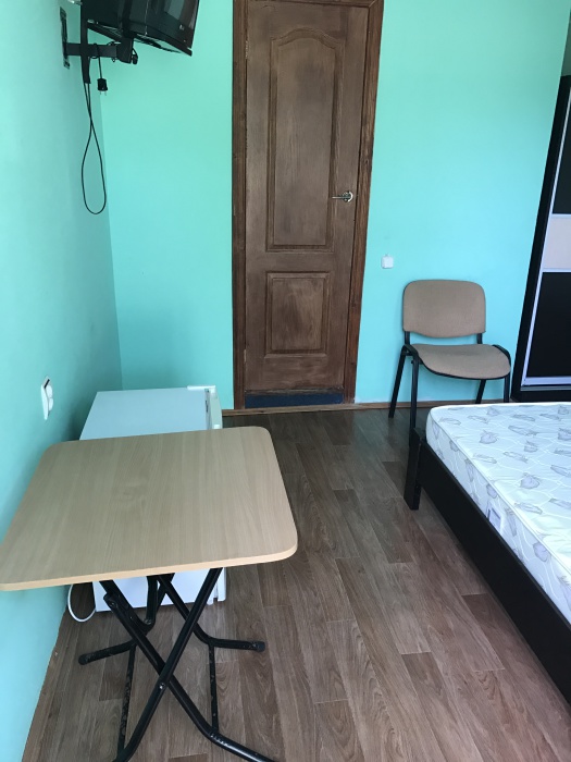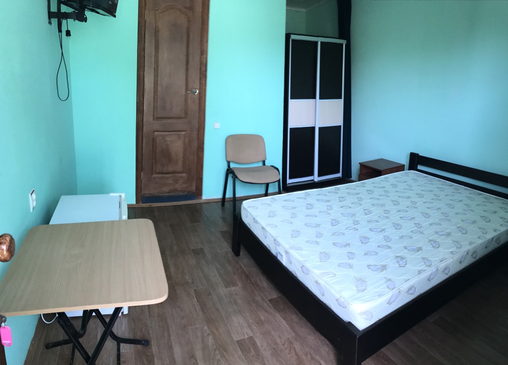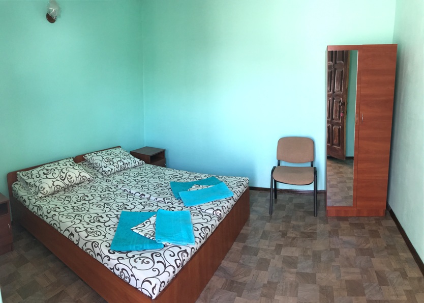 В номере вся необходимая мебель: кровати, шкаф с зеркалом, прикроватные тумбочки, стол, стульчики. Туалет, умывальник и душ находятся на территории, удобства с хорошим евро ремонтом, горячая и холодная вода - круглосуточно.