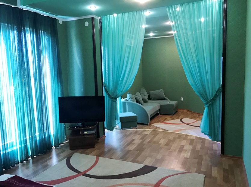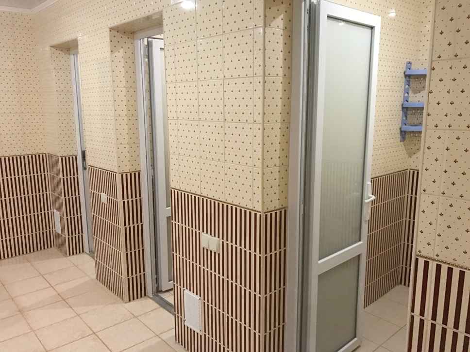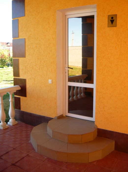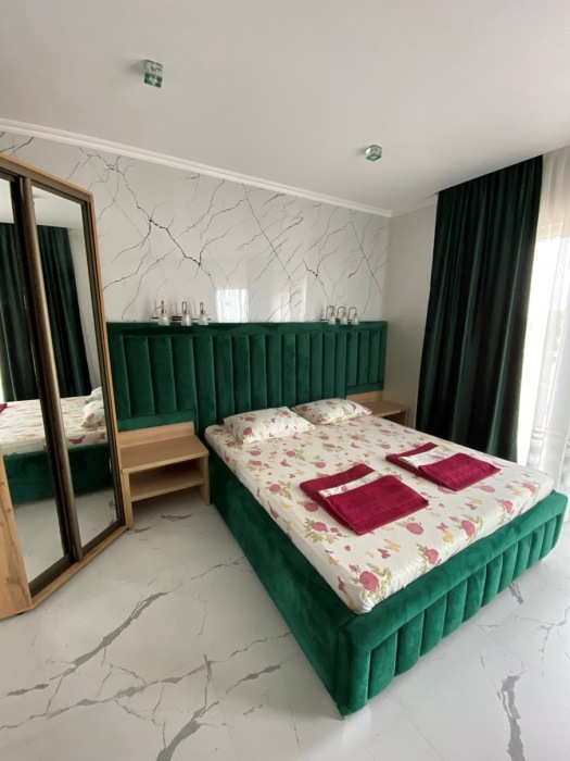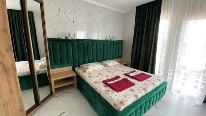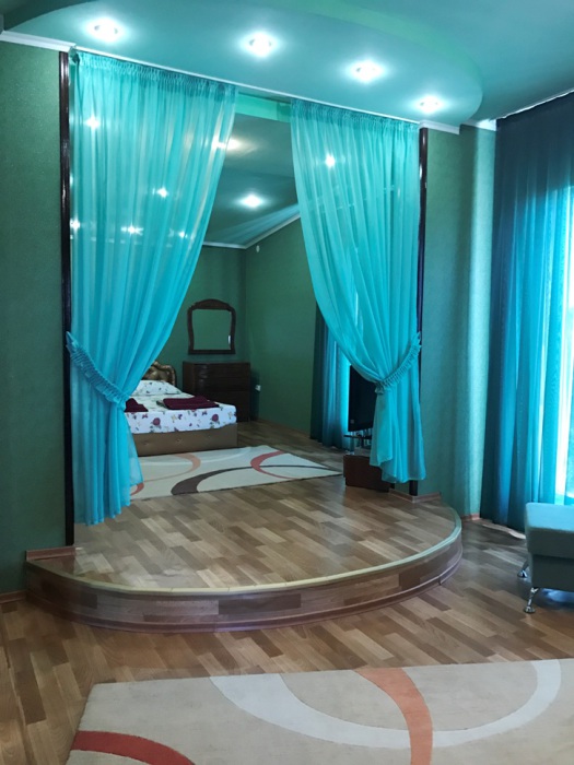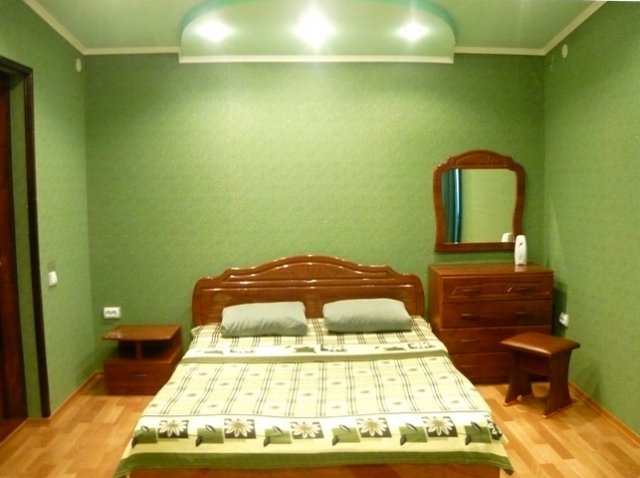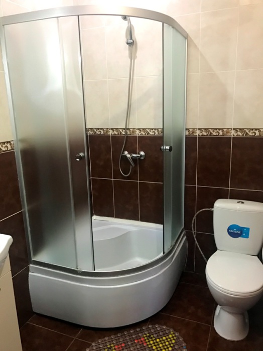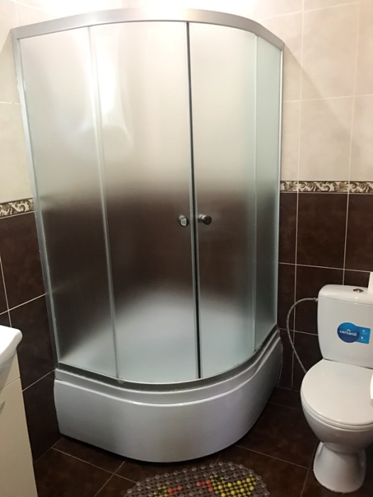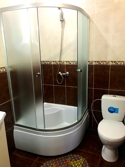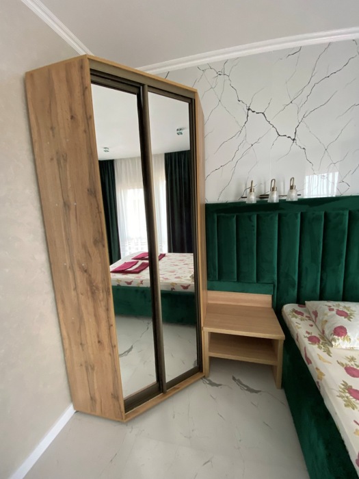 В номере вся необходимая мебель: кровати, шкаф с зеркалом, прикроватные тумбочки, стол, стульчики. Туалет, умывальник и душ находятся на территории, удобства с хорошим евро ремонтом, горячая и холодная вода - круглосуточно.