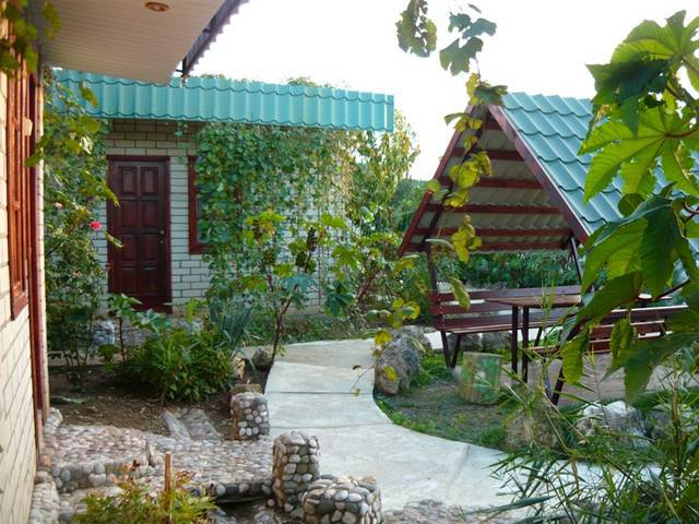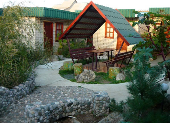 номера Эконом с удобствами - расположены в одноэтажных корпусах-домиках современного образца, у каждого свой отдельный вход с территории, напротив номеров имеются уютные беседки для отдыха, качели, много зелени.