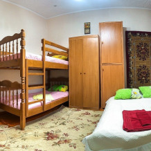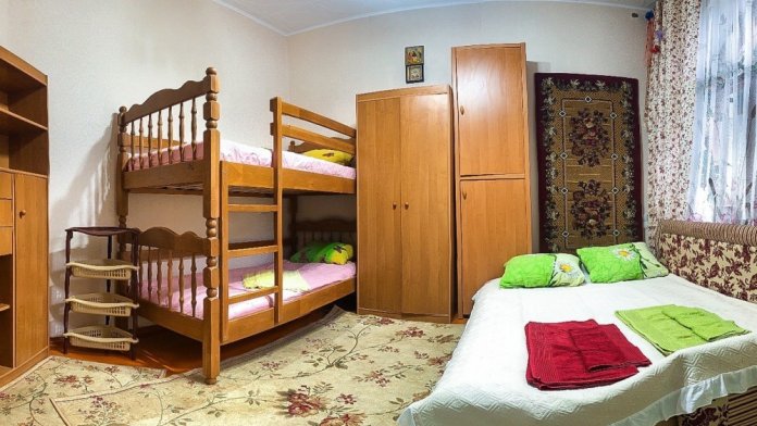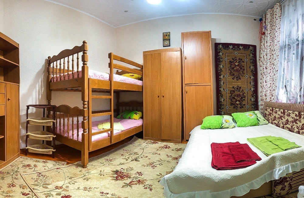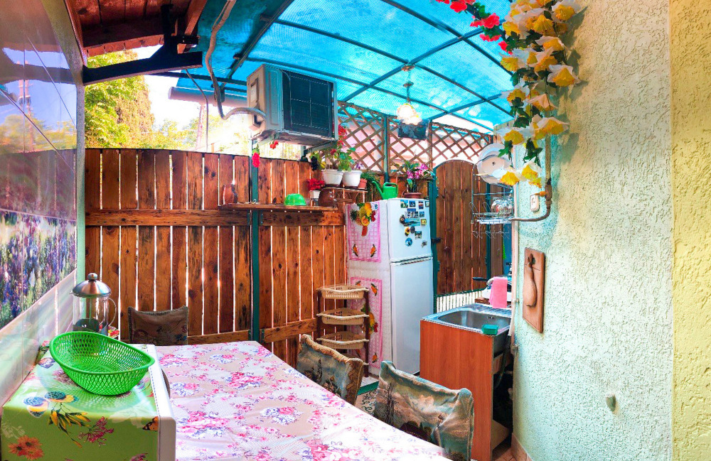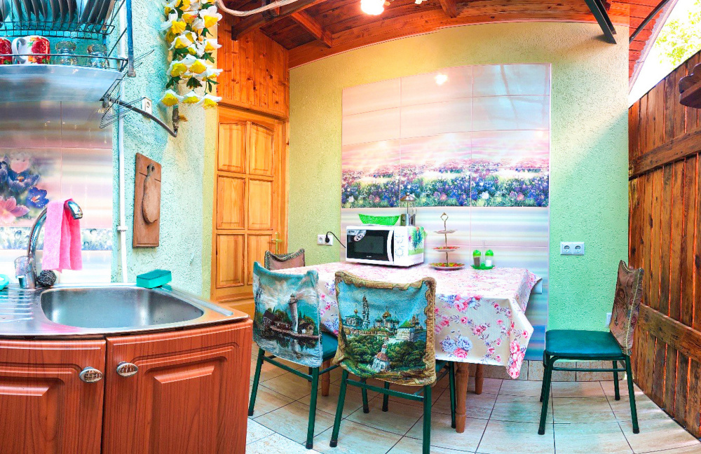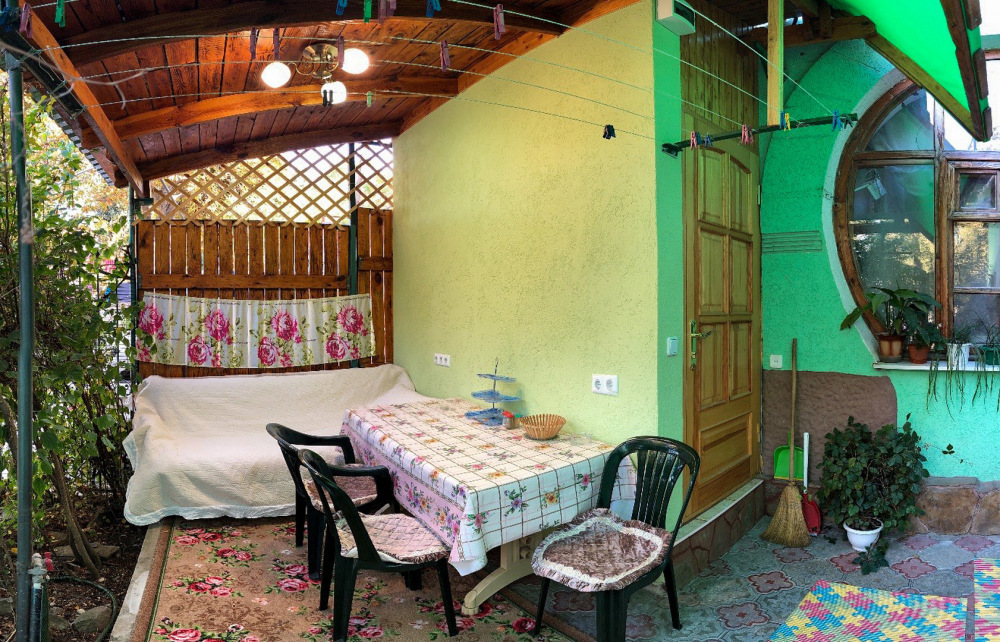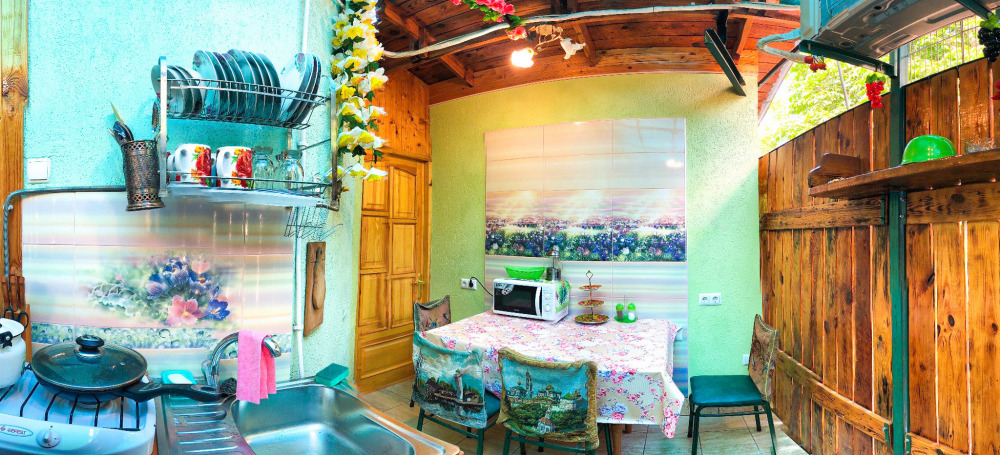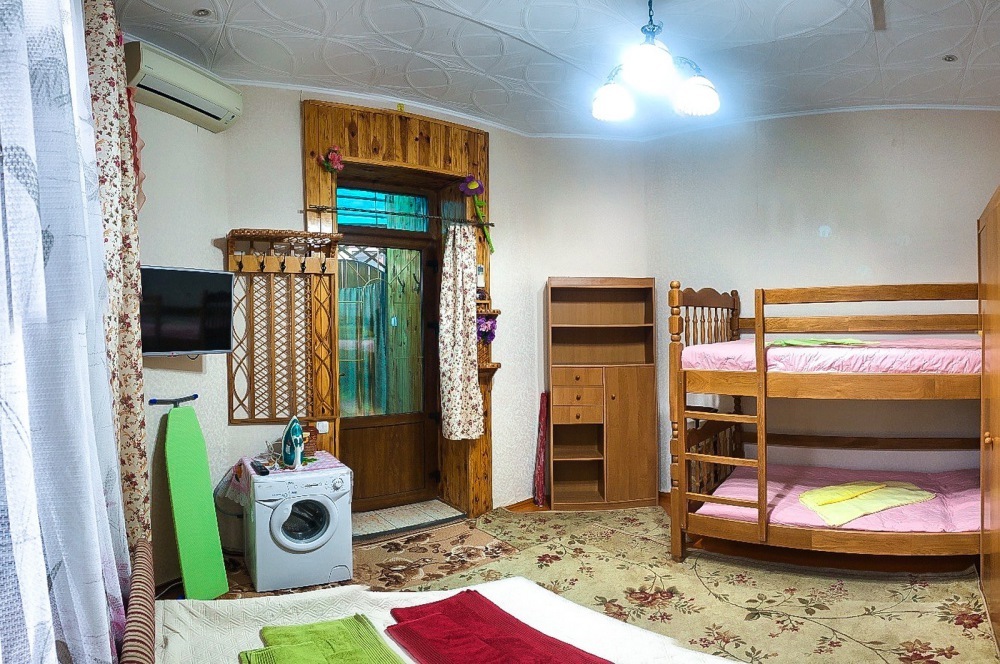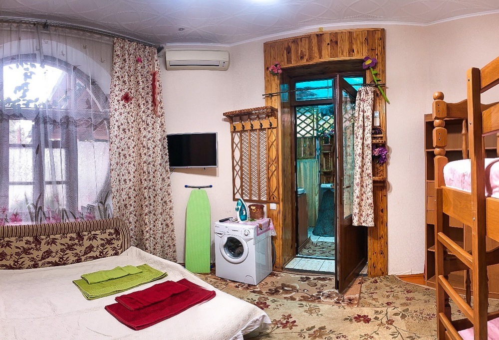 В номере 2-спальный диван и двухъярусная кровать шириной 90 см. Все удобства: WI-FI, кондиционер, санузел, банные принадлежности,. Летняя кухня со всем необходимым, микроволновая печь. Еесть возможность пользования мангалом.