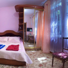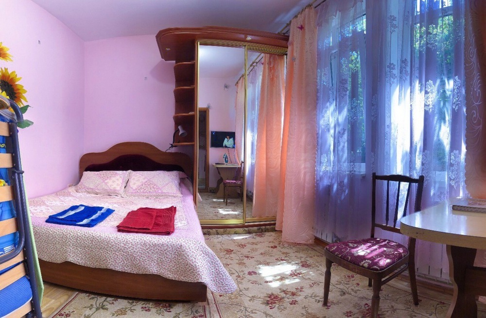 Апартаменты со своим зеленым двориком. В номере 2-спальная кровать, 2-спальный диван и кресло-кровать. Все удобства: WI-FI, кондиционер, санузел, банные принадлежности, стиральная машинка. Кухня со всем необходимым. Есть возможность пользования мангалом, отдельный дворик с летней беседкой с 2-спальной кроватью под навесом (сон на свежем воздухе).