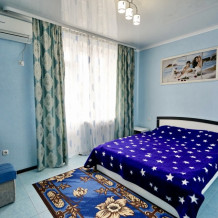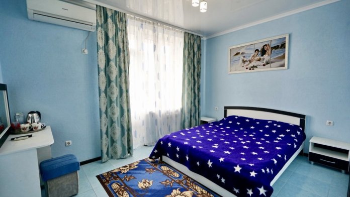 Спальные места: две односпальные кровати и двуспальная кровать или 4 односпальных кровати. Мебель: стулья, стол, шкаф, прикроватные тумбочки, прихожая, вешалка, зеркало. Техника: Телевизор, холодильник, кондиционер. Во всех номерах личный санузел, интернет, постельное бельё, полотенца.