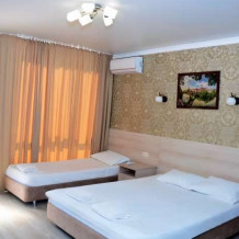 Спальные места: три односпальные кровати. Мебель: стулья, стол, шкаф, прикроватные тумбочки, прихожая, вешалка, зеркало. Техника: Телевизор, холодильник, кондиционер. Во всех номерах личный санузел, интернет, постельное бельё, полотенца.