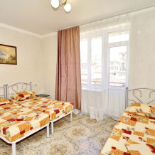 Спальные места: три односпальные кровати или двуспальная и односпальные кровати или двуспальная кровать и кресло-кровать. Мебель: стулья, стол, шкаф, прикроватные тумбочки, прихожая, вешалка, зеркало. Техника: Телевизор, холодильник, кондиционер. Во всех номерах личный санузел, интернет, постельное бельё, полотенца.