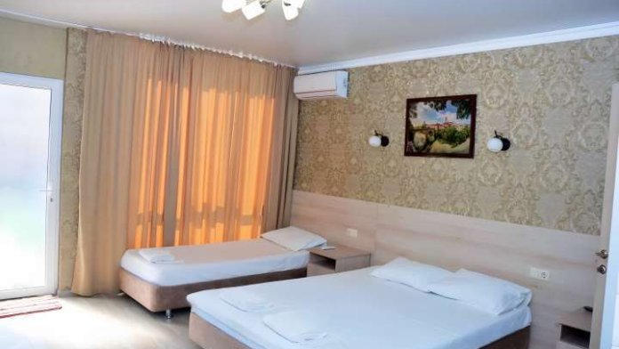 Спальные места: две односпальные кровати и диван кровать или 4 односпальных кровати. Мебель: стулья, стол, шкаф, прикроватные тумбочки, прихожая, вешалка, зеркало. Техника: Телевизор, холодильник, кондиционер. Во всех номерах личный санузел, интернет, постельное бельё, полотенца.