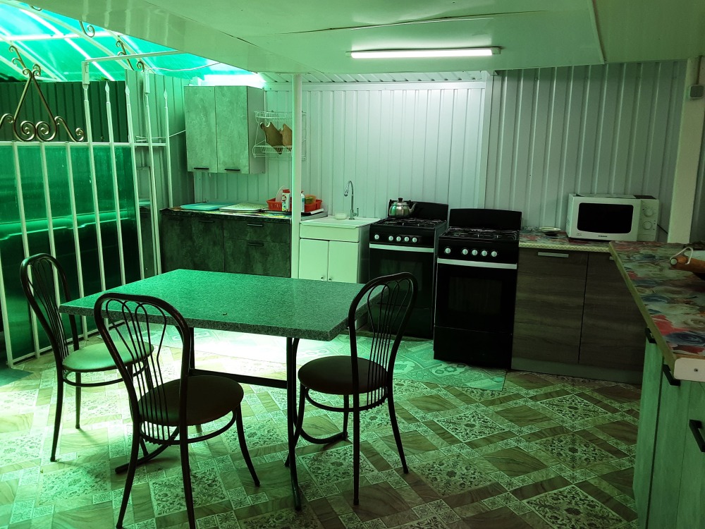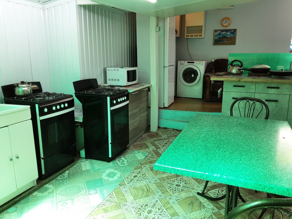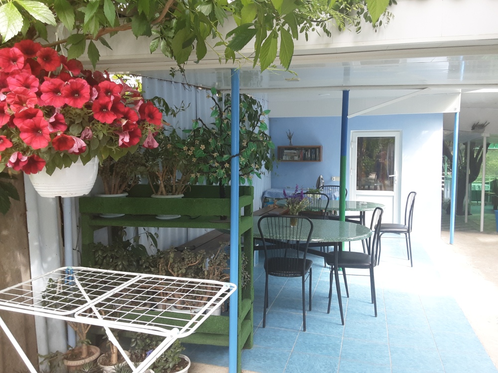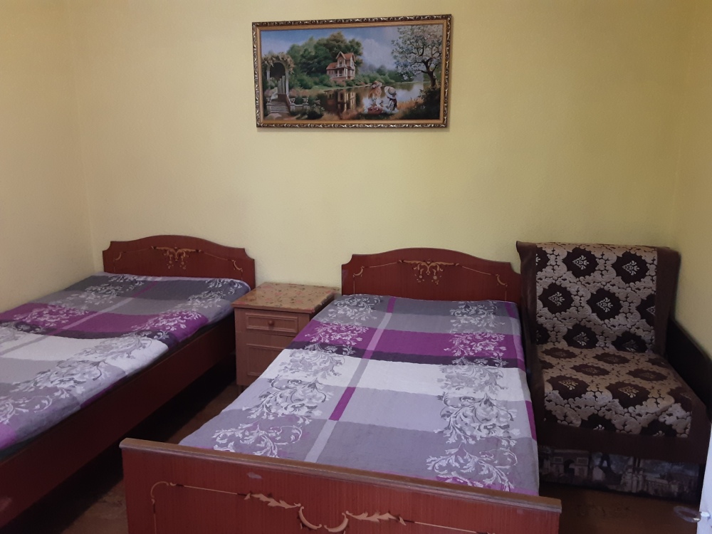 В номере двухспальная кровать,односпальная кровать,диван,стол,шкаф - купе,телевизор,интернет,вентилятор,рядом общая кухня с необходимой посудой,летняя площадка на два номера с личным обеденным столом,на общей кухне кухонный стол с личной посудой,душ и туалет на два номера,горячая вода круглосуточно,можно пользоваться стиральной машинкой,мангалом,парковкой.