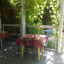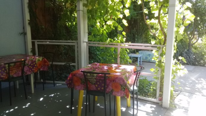 Номер на втором этаже с балконом,вход отдельный,туалет и раковина в номере,душ на три номера рядом с номером,летняя площадка на два номера с личным обеденным столом,на общей кухне личный кухонный стол с личной посудой.