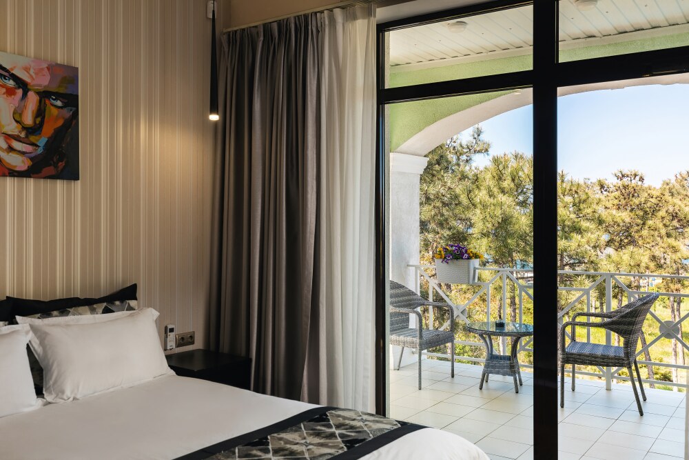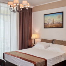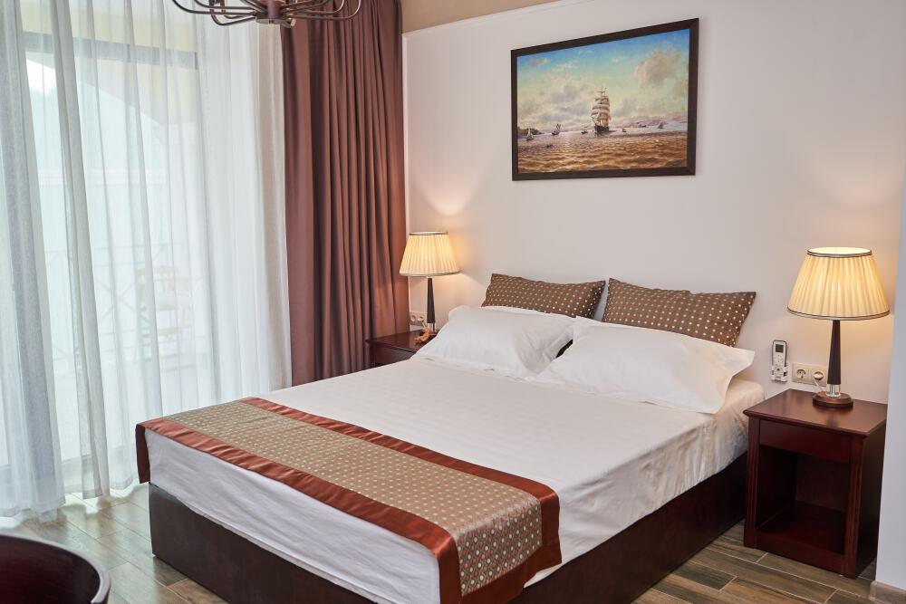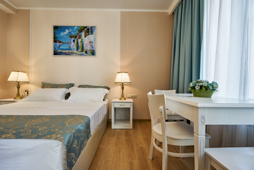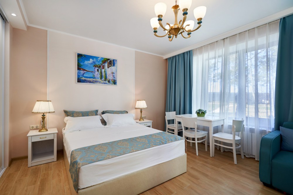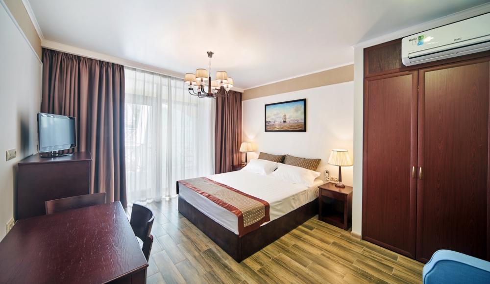 Просторная двухместная студия c классическим дизайном интерьера, укомплектована всем необходимым для комфортного проживания. Ортопедическая односпальная кровать, кресло, рабочая зона и плазменный телевизор. Просторный санузел. Панорамная терраса на входе на 2 номера, открывающая прекрасный вид на территорию комплекса, оборудована комплектом ротанговой мебели.