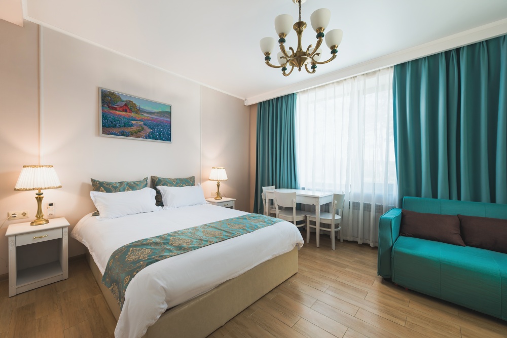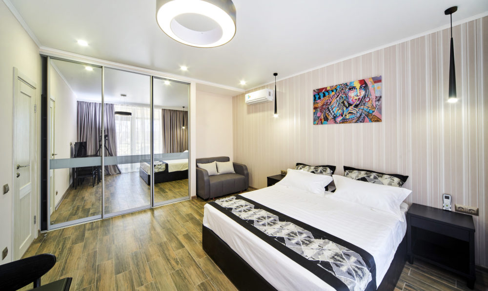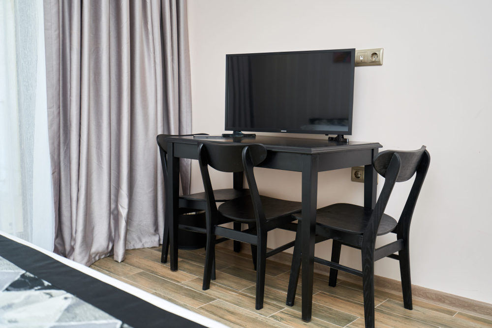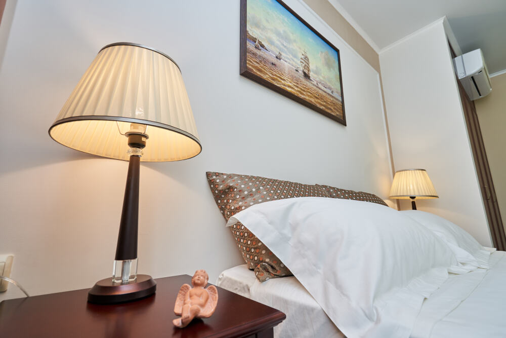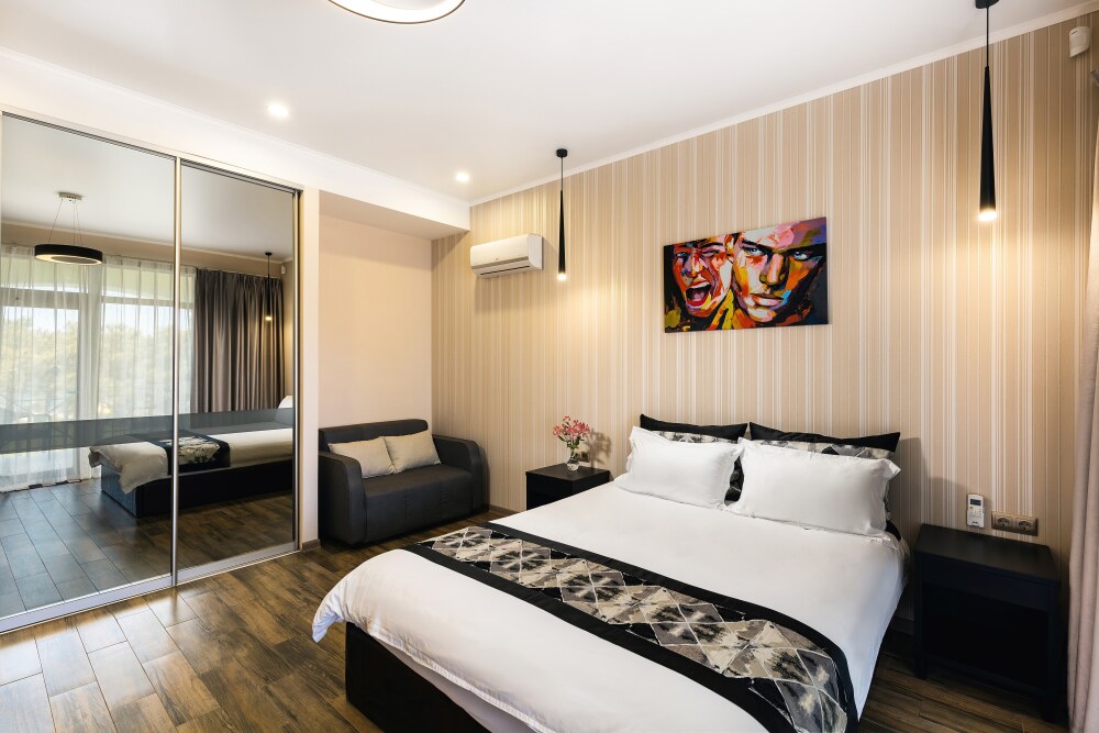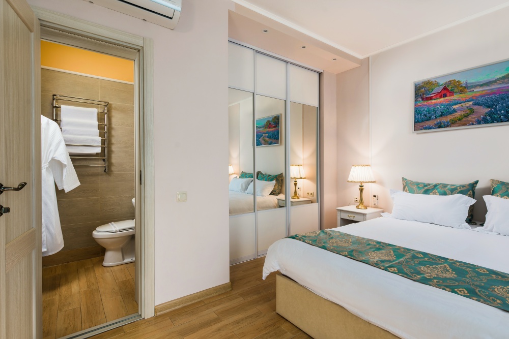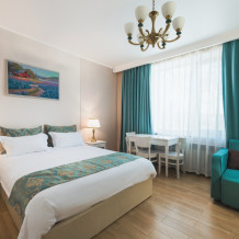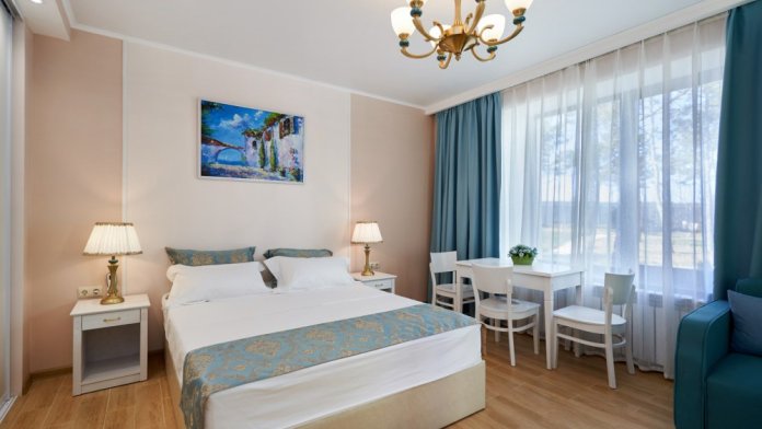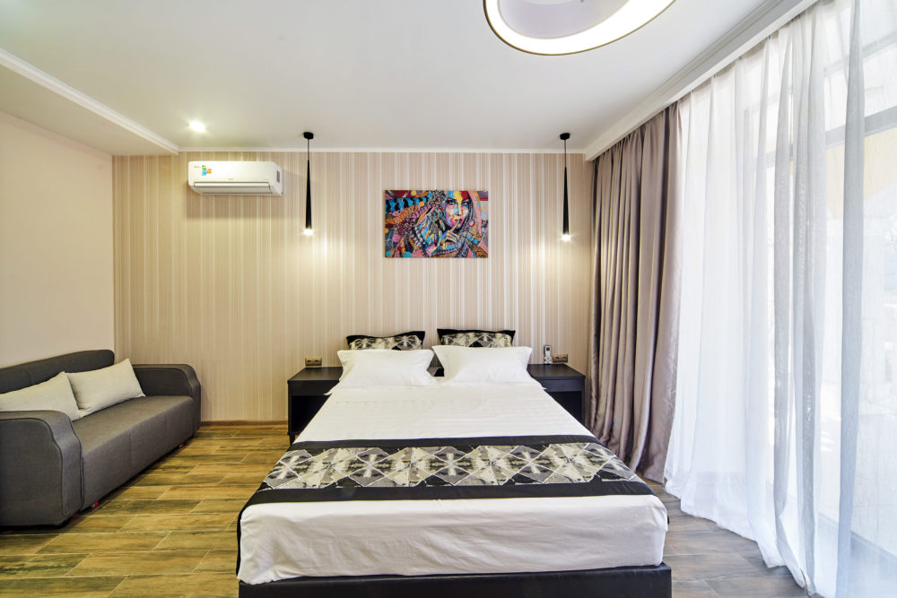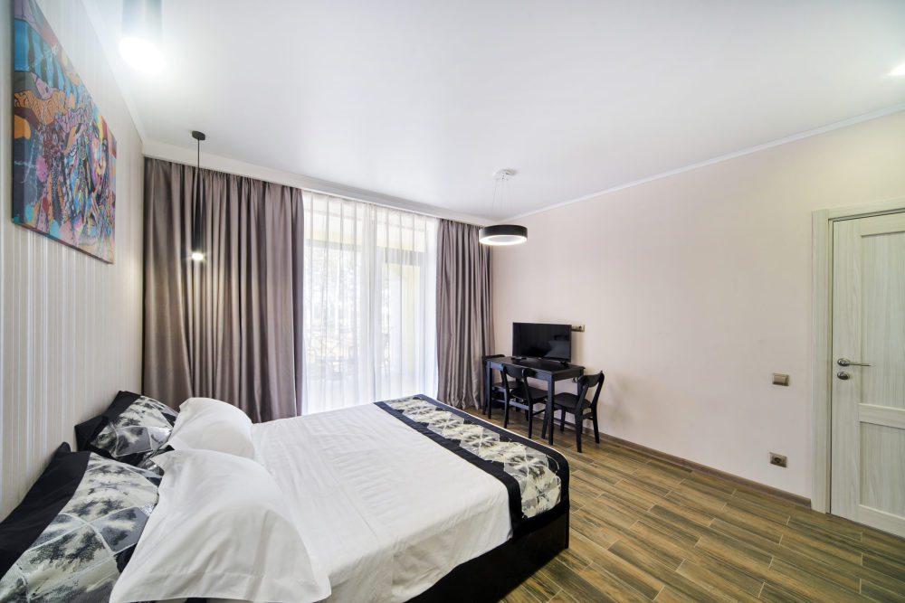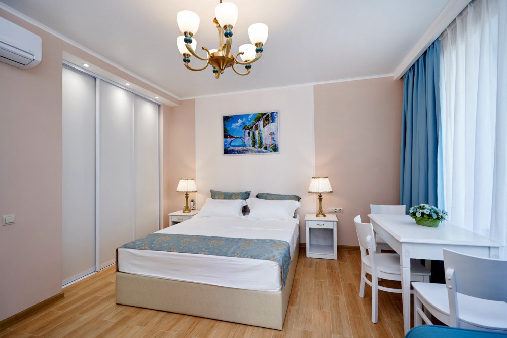Все гостевые студии выдержаны в мягких кремовых тонах, оснащены душевыми кабинами, современной мебелью с ортопедическими матрасами, мини-сейфами, чайными наборами, наборами полотенец, фенами. Используется только высококачественный текстиль. Комфортные и удобные студии выполнены в трех стилях: классика, прованс и модерн. Вода горячая и холодная подается круглосуточно из собственной артезианской скважины и проходит дополнительную многоуровневую очистку.