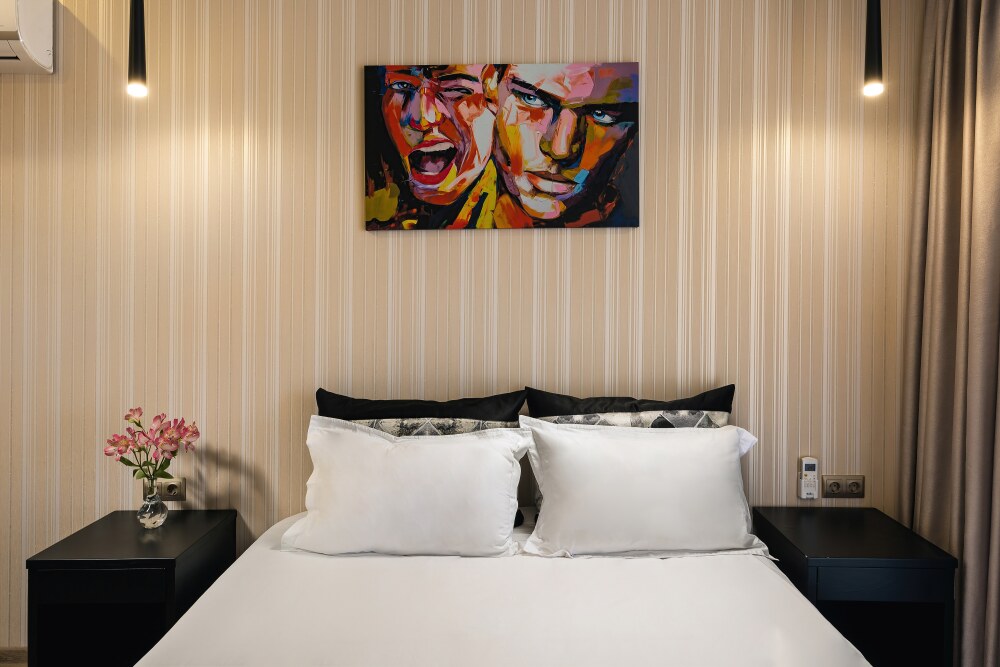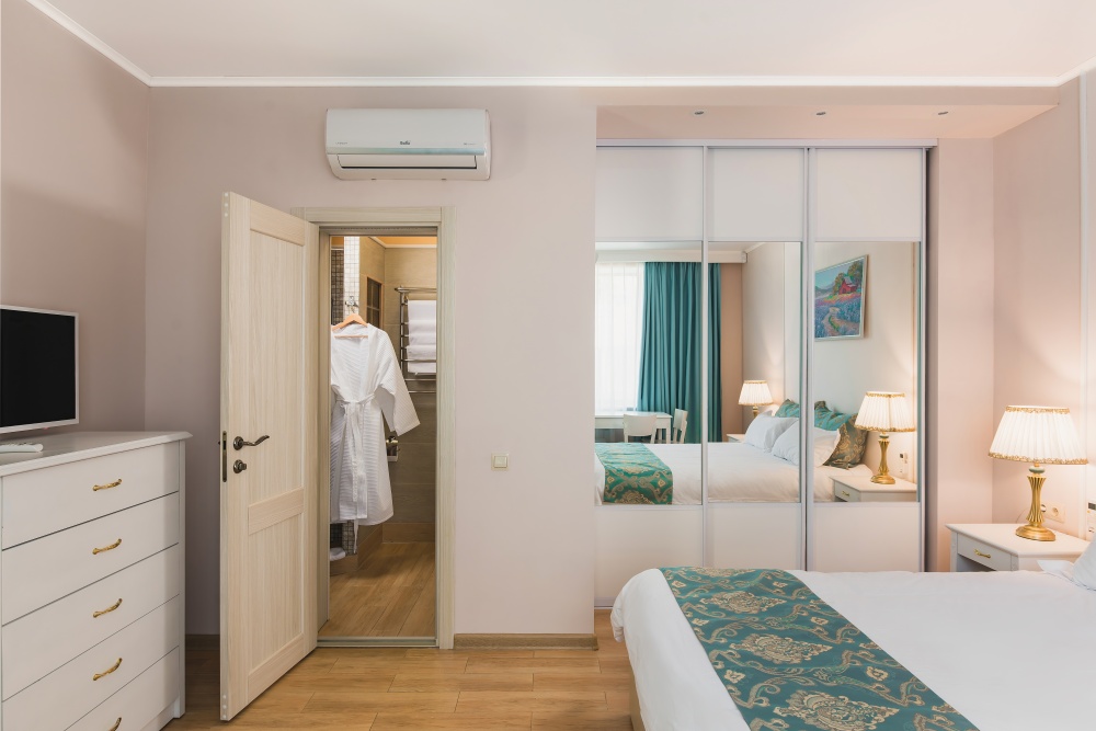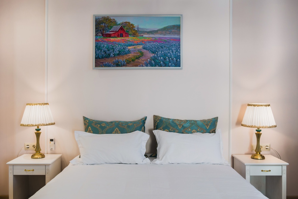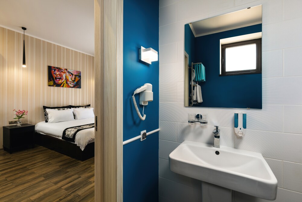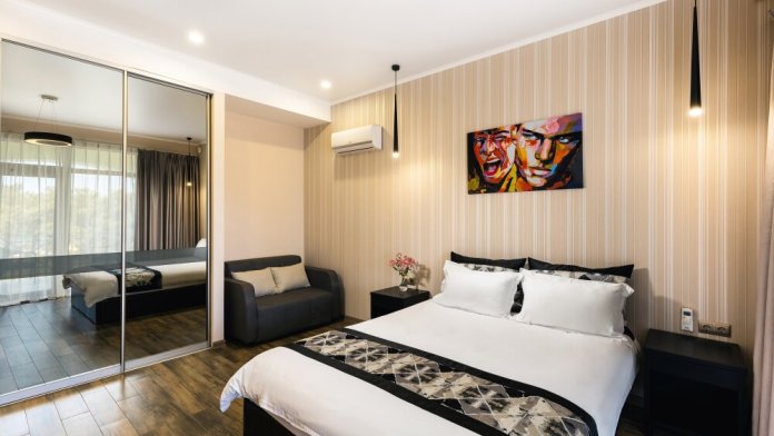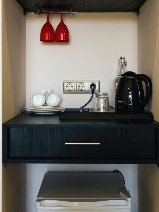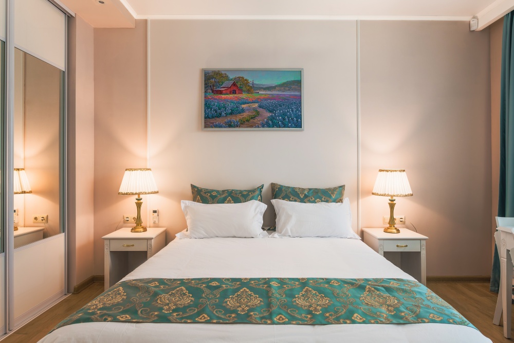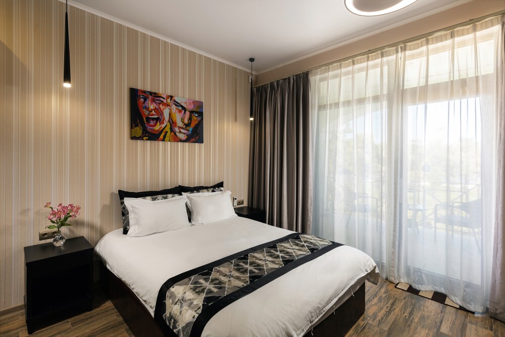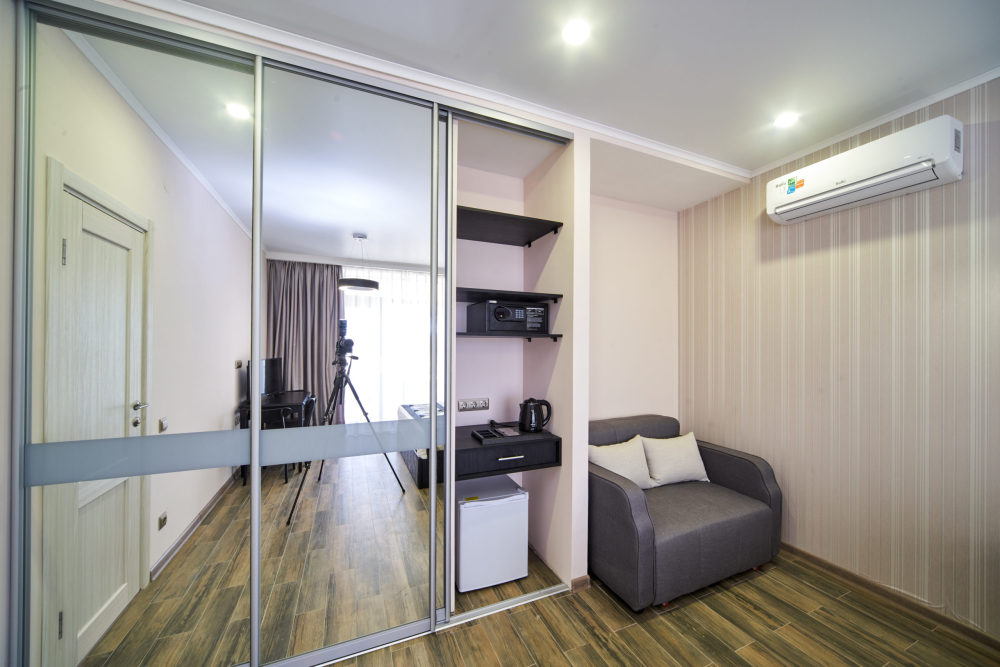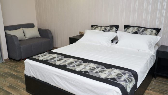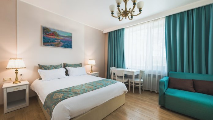Все гостевые студии выдержаны в мягких кремовых тонах, оснащены душевыми кабинами, современной мебелью с ортопедическими матрасами, мини-сейфами, чайными наборами, наборами полотенец, фенами. Используется только высококачественный текстиль. Комфортные и удобные студии выполнены в трех стилях: классика, прованс и модерн. Вода горячая и холодная подается круглосуточно из собственной артезианской скважины и проходит дополнительную многоуровневую очистку.