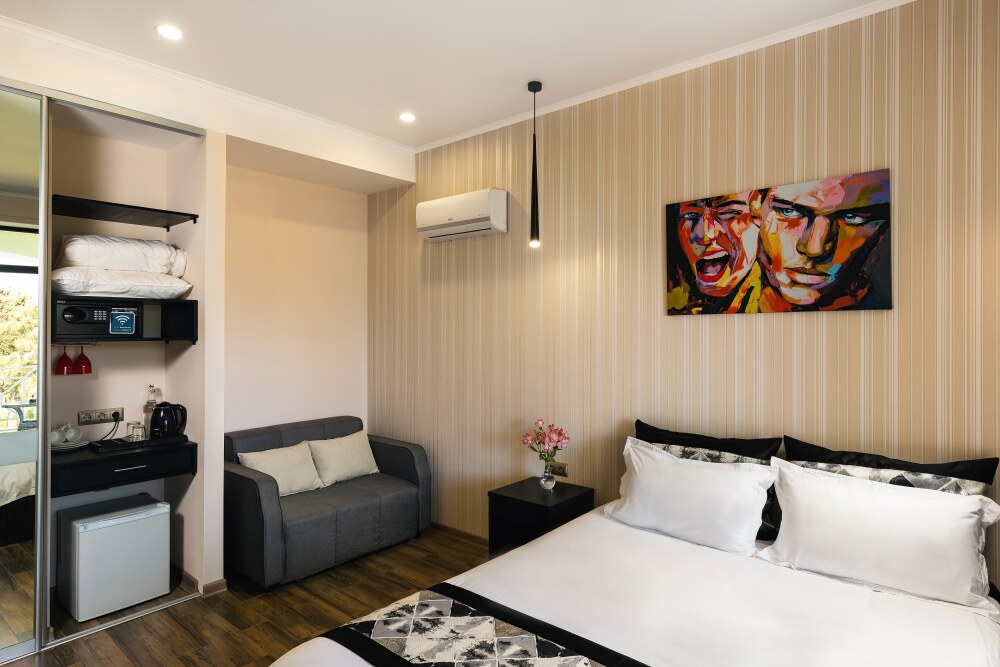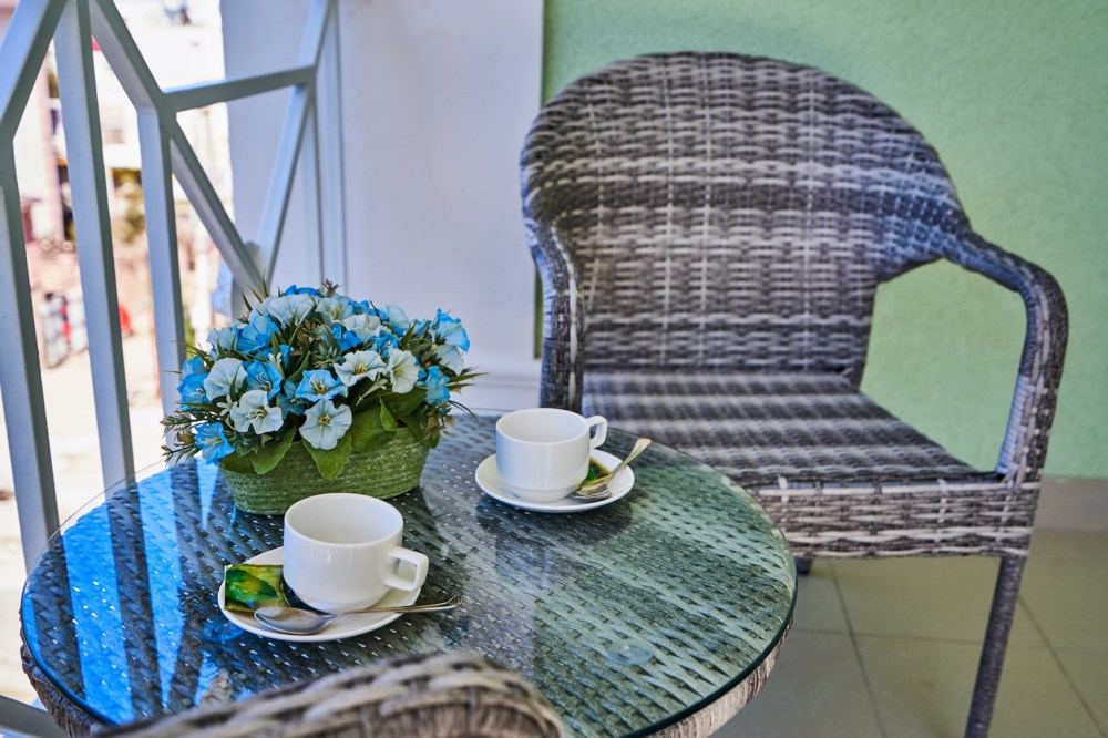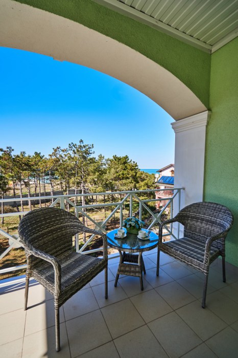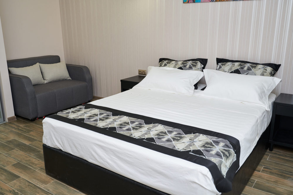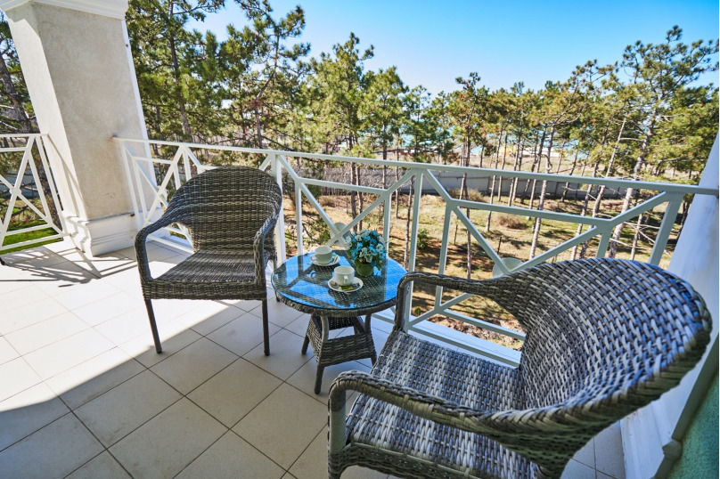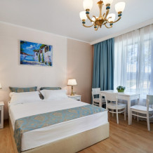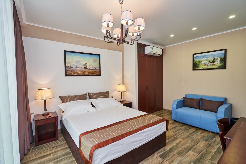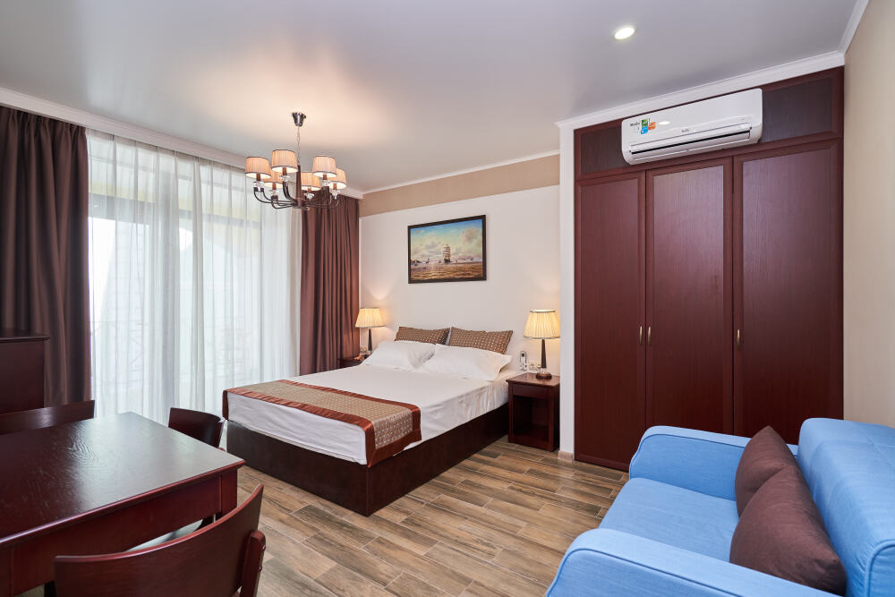 Просторная семейная студия, расположена на верхнем этаже с прекрасным видом и собственной террасой, укомплектована всем необходимым для комфортного проживания до 4 гостей (включая 1 ребенка до 4 лет). Двуспальная кровать с ортопедическим матрасом раскладной диван, шириной 1,2 м., превращающийся в комфортное спальное место, большой шкаф-купе, рабочая зона и плазменный телевизор. Большая отдельная панорамная терраса на входе, открывающая прекрасный вид на море и территорию гостевого комплекса, оборудована комплектом ротанговой мебели.