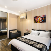 Просторная двухместная студия в светлых тонах, укомплектована всем необходимым для комфортного проживания. Ортопедическая односпальная кровать, кресло, рабочая зона и плазменный телевизор. Просторный санузел. Панорамная терраса на входе на 2 номера, открывающая прекрасный вид на территорию виллы, оборудована комплектом ротанговой мебели.