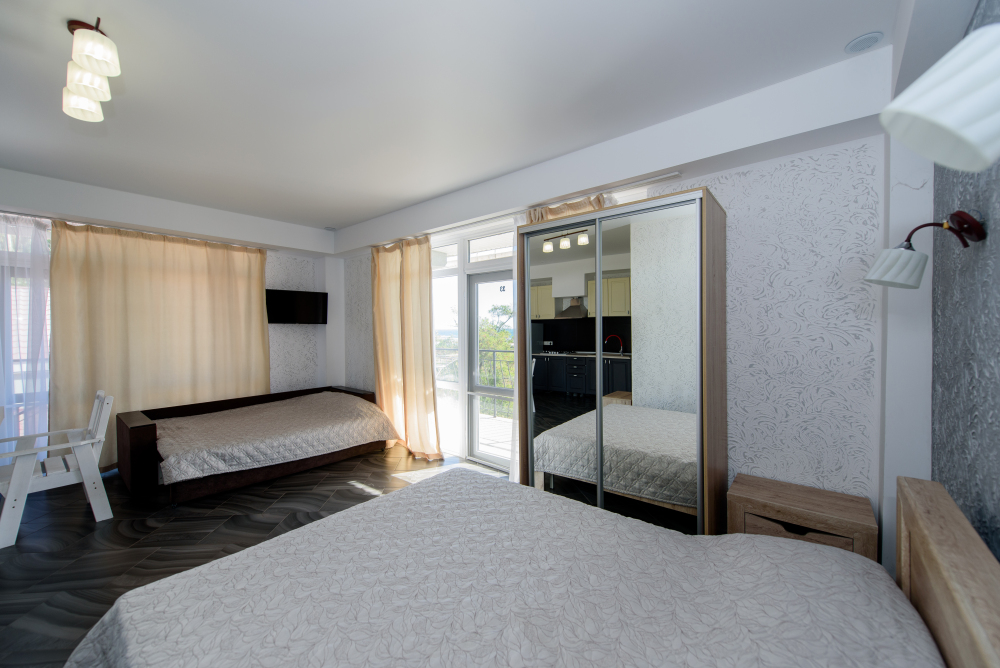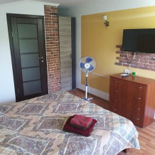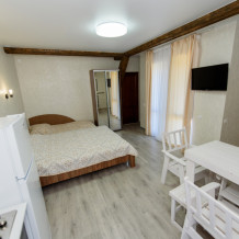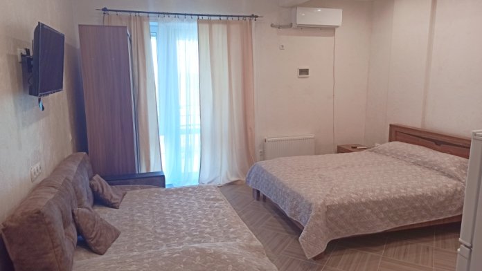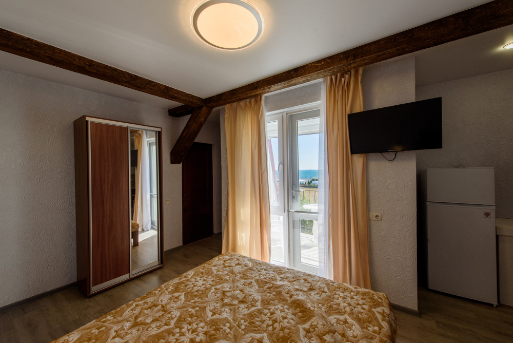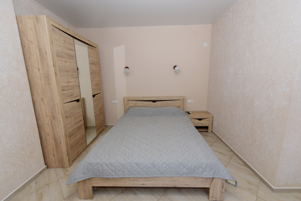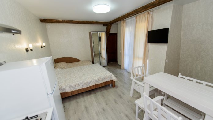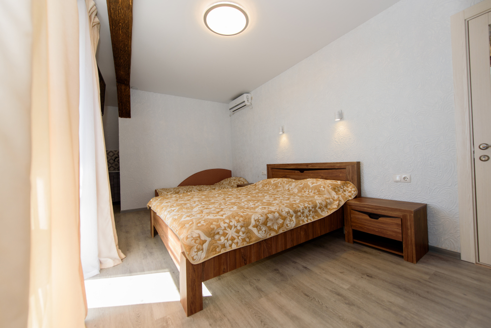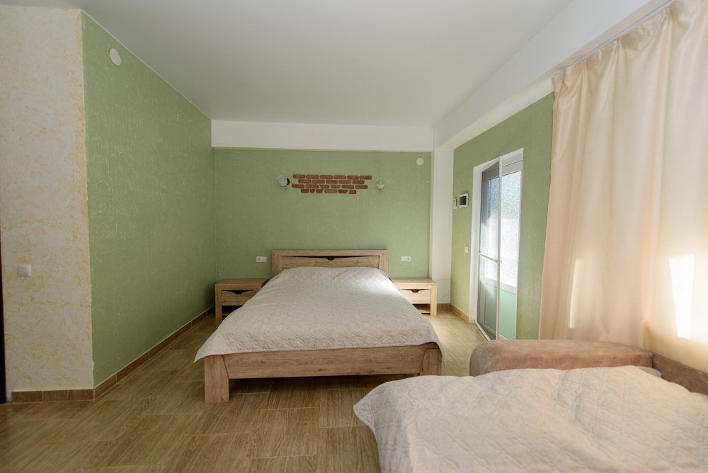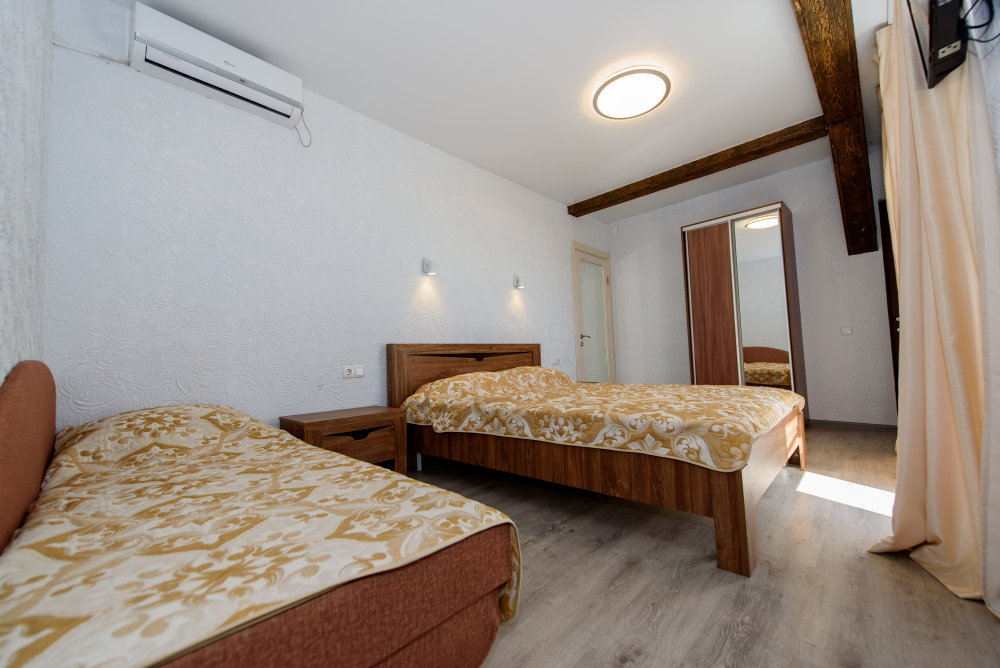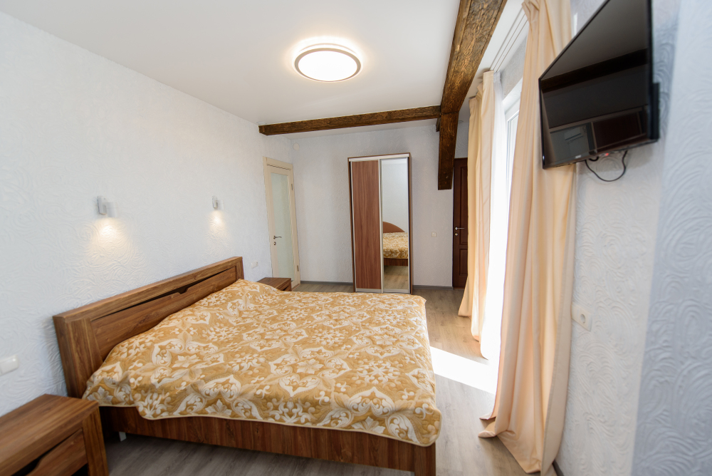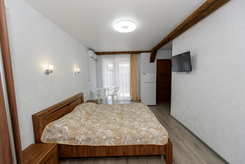 Каждый из номеров укомплектован тремя спальными местами (двуспальная кровать и дополнительное место – кресло-кровать) или двумя спальными местами: двуспальная кровать